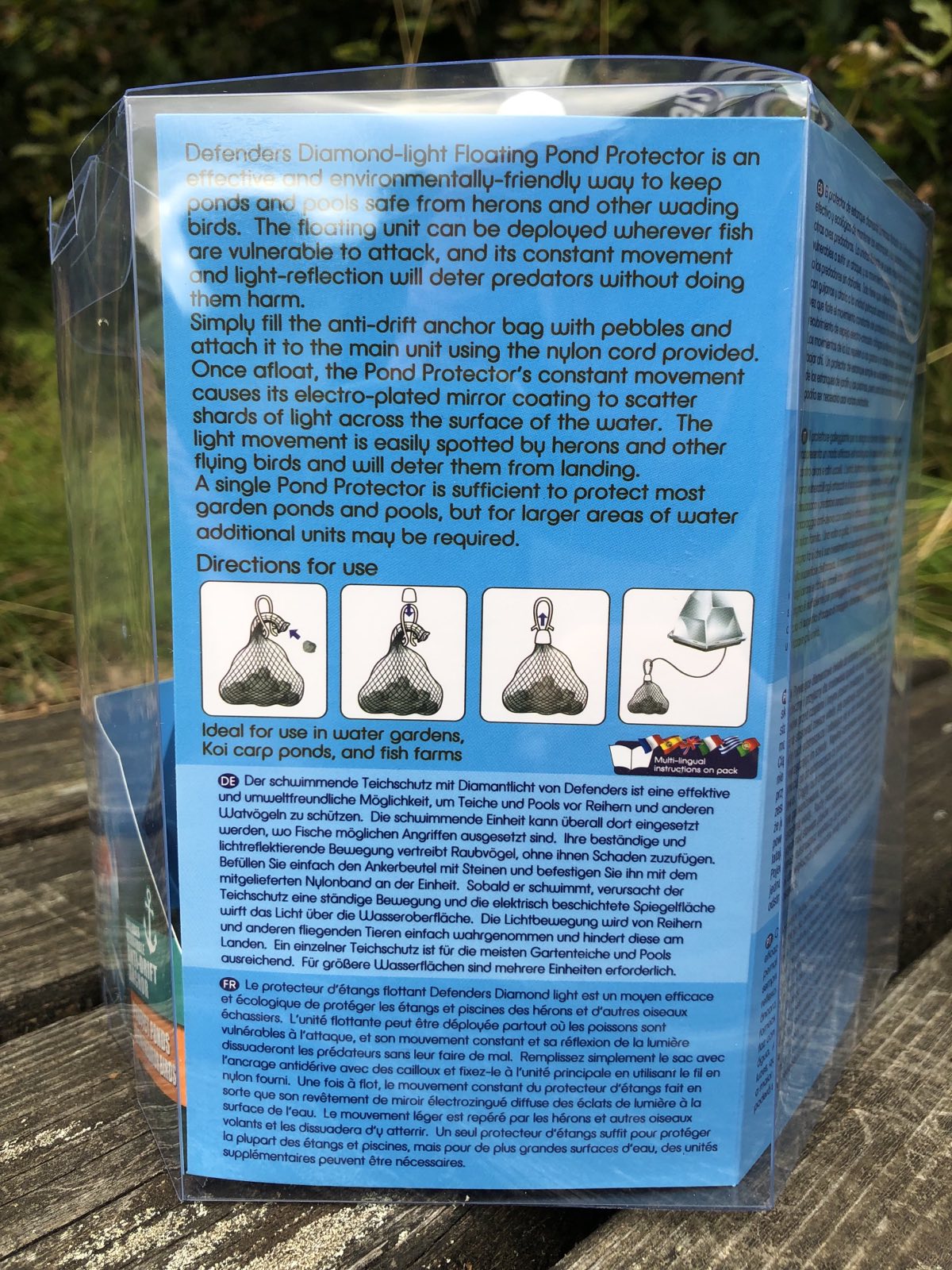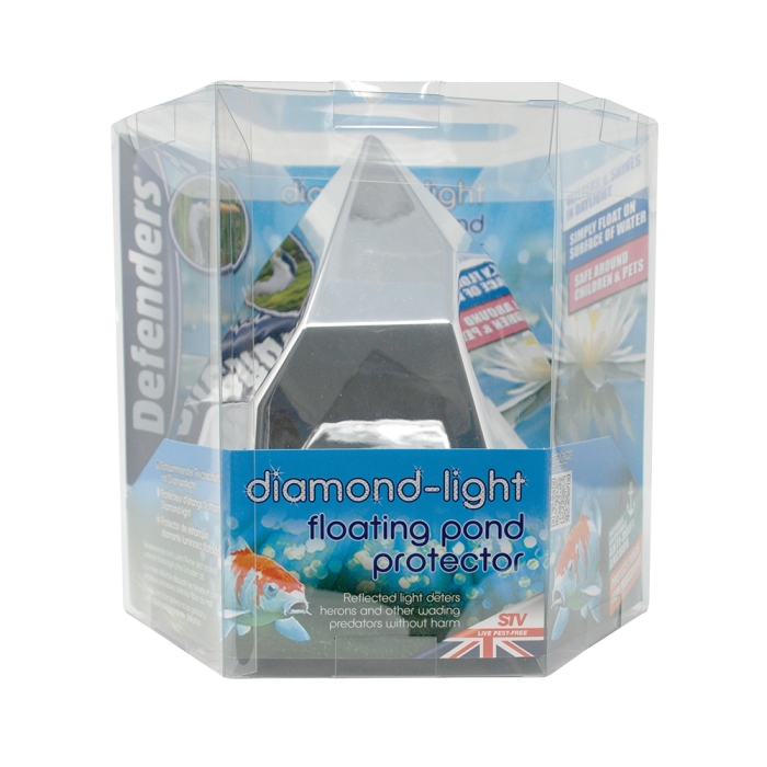 Defenders® Diamond-Light Floating Pond Protector är ett effektivt och miljövänligt sätt att skydda dammar och bassänger från hägrar och andra vadfåglar. Den flytande enheten kan placeras varhelst fisk är utsatt för attacker, och dess konstanta rörelse och ljusreflektion kommer att avskräcka fåglar utan att skada dem.