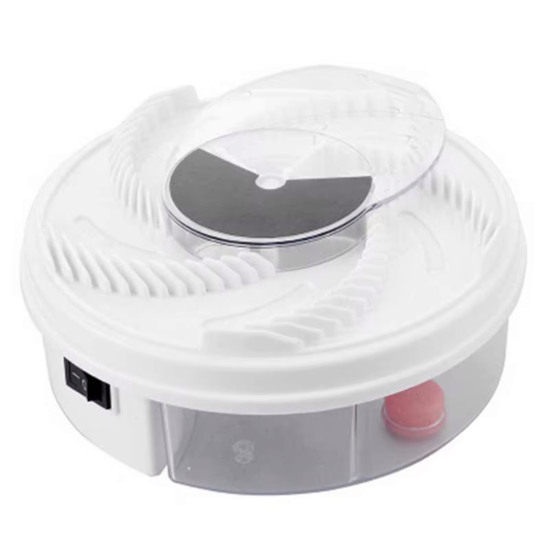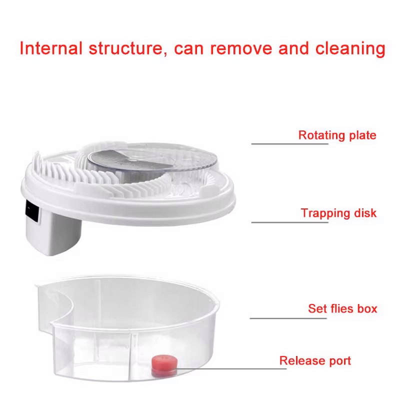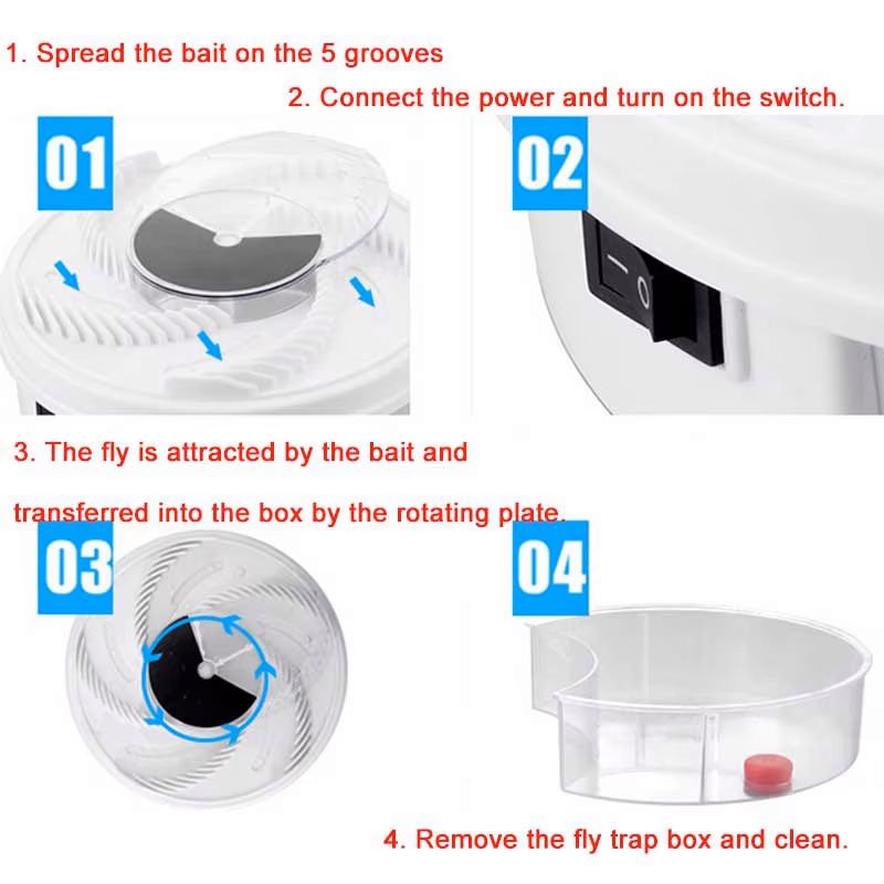 - Flugorna lockas av betet och förs in i boxen med hjälp av den roterande plattan.