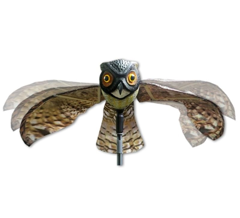 Flygande Uggla (prowler owl) En unik Fågelskrämma som består av ett huvud av hårdplast och vingar och kropp av tygmaterial. Denna design gör att ugglan rör sig med vinden i en naturlig jaktposition och effektivt skrämmer bort olika fåglar. Ugglan är mer än en meter mellan vingspetsarna.