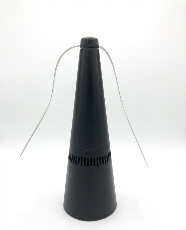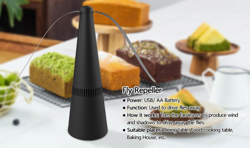 Flugskrämmaren drivs av USB- eller AA-batteri för att rotera de mjuka fläktbladen