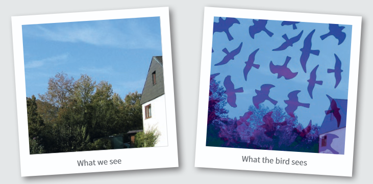 Att människor och fåglar uppfattar UV-spektrumet olika har varit känt länge. Både birdpen® (Marker) och fågelsiluett® (Folie) utnyttjar detta faktum. Problemet med fågelkollisioner är ett mycket komplext ämne: Inte bara omgivningen och ljusförhållandena, utan också tiden på året och reflektionen på fönstret spelar en stor roll.