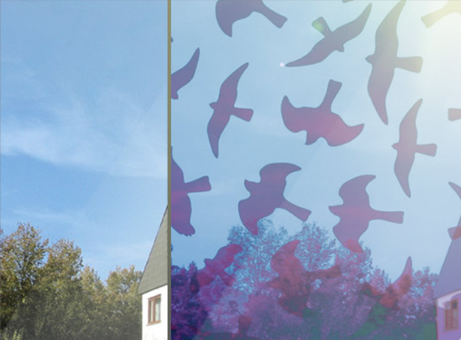 Ett effektivt skydd mot fågelkollisioner för stora ytor är genomskinliga fågelsiluett. Fågelapplikationerna som är gjorda av transparent folie visar utmärkta resultat när det gäller skydd mot fågelkollisioner. För bästa resultat bör flera fågelsiluett appliceras över hela glasytan.