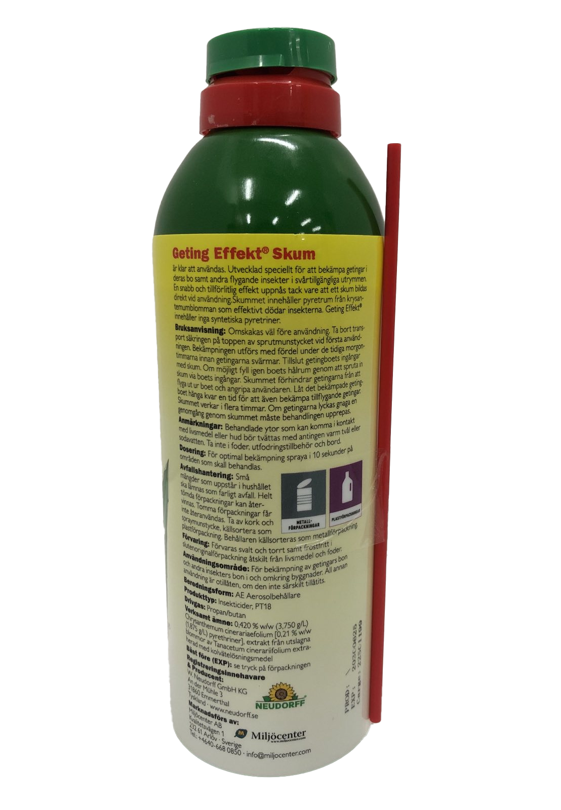 Användning: Omskakas väl före användning. Bekämpning utförs med fördel under de tidiga morgontimmarna innan getingarna svärmar. Tillslut getingboets ingångar med skum. Om möjligt fyll igen boets hålrum genom att spruta in skum via boets ingångar. Skumme förhindrar getingarna från att flyga ut ur boet och angripa användaren. Låt det behandlade getingboet hänga kvar en tid för att även bekämpa tillflygande getingar. Skummet verkar i flera timmar. Vid bekämpning av krypande insekter som kackerlackor och gråsuggor skall insekternas gömställen fyllas väl med skum.