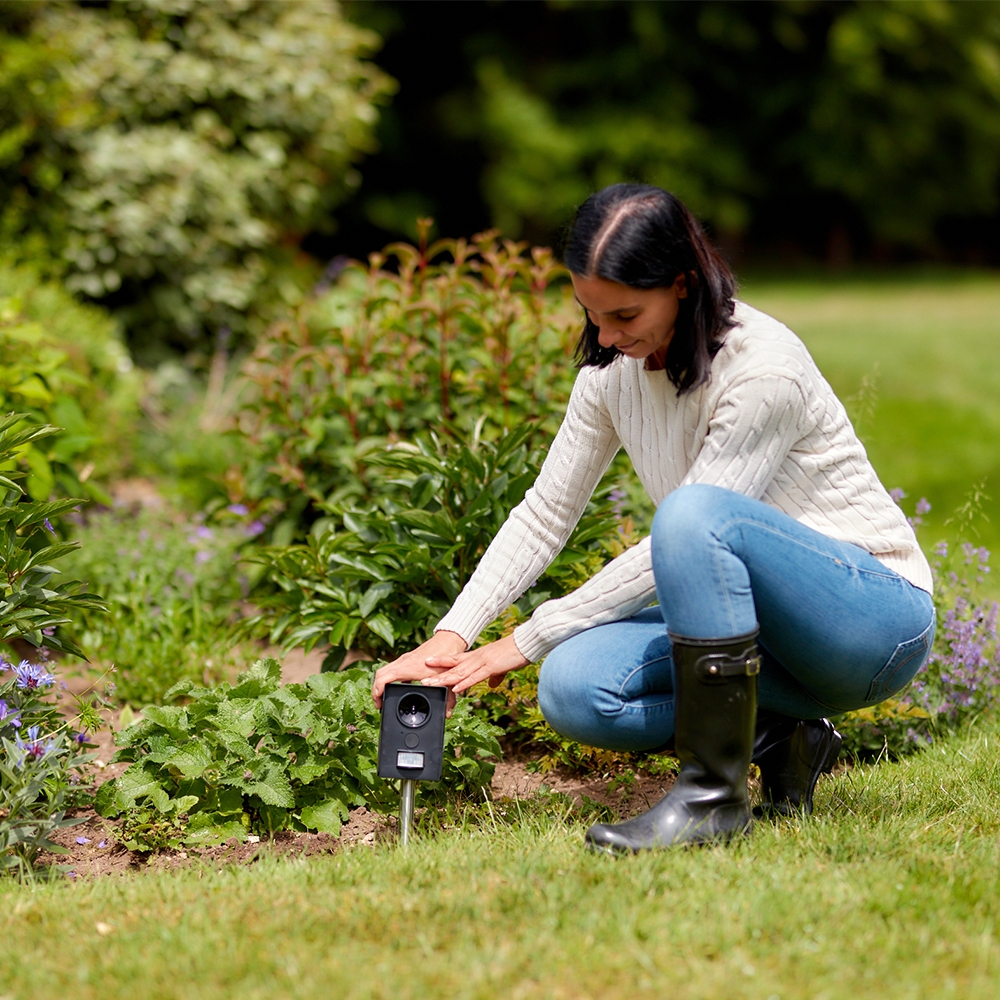 Nya Solcells version! Upptäcker och skrämmer bort katter från din trädgård.