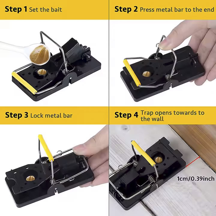 Stark musfälla som är enkel att ladda, och enkel tömma. Sätt bete i fällan och för tillbaka bygeln för att aktivera låsregeln.