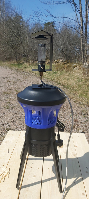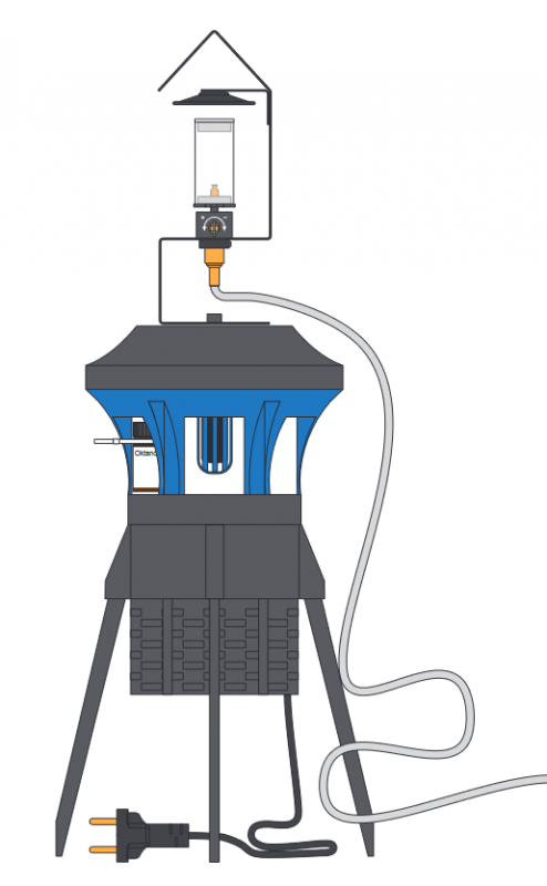 Myggfångaren lockar till sig mygg genom en kombination av värme, koldioxid, LED UV-ljus och lukt (oktenol).