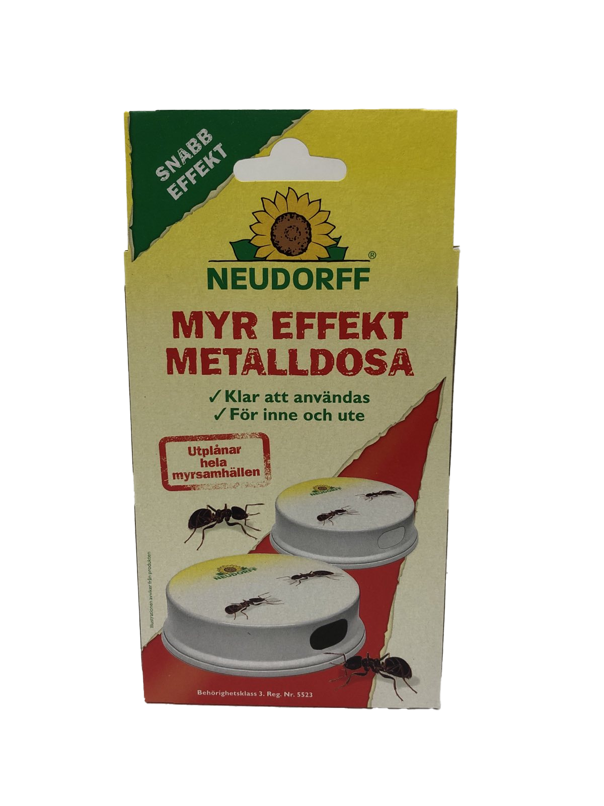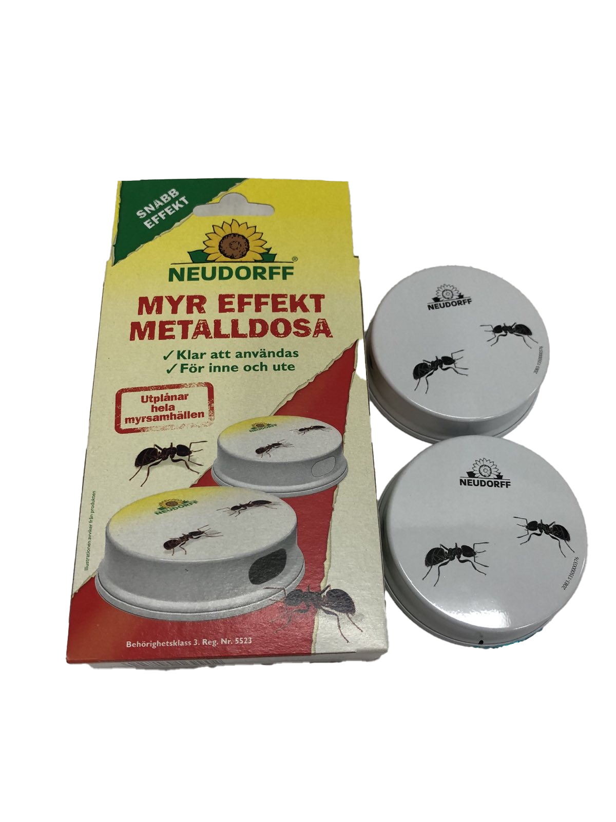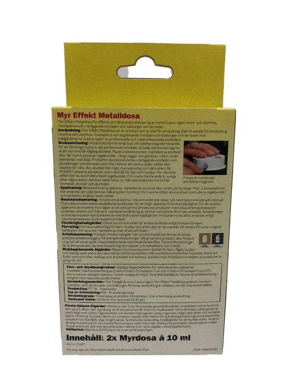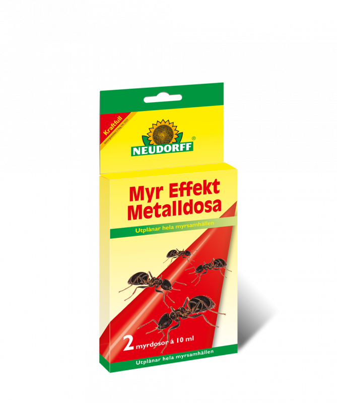 Myr Effekt Metalldosa lockar till sig arbetsmyror och därmed bekämpas hela myrsamhällen effektivt. Används med fördel inomhus, på balkonger samt terrasser. Arbetsmyrorna dricker av betet och tar med sig det till boet där hela kolonin matas och utplånas. Tack vare en fördröjd effekt, kan varje myra gå flera gånger mellan dosan och myrsamhället.