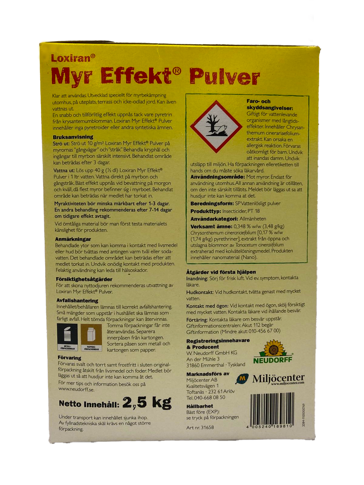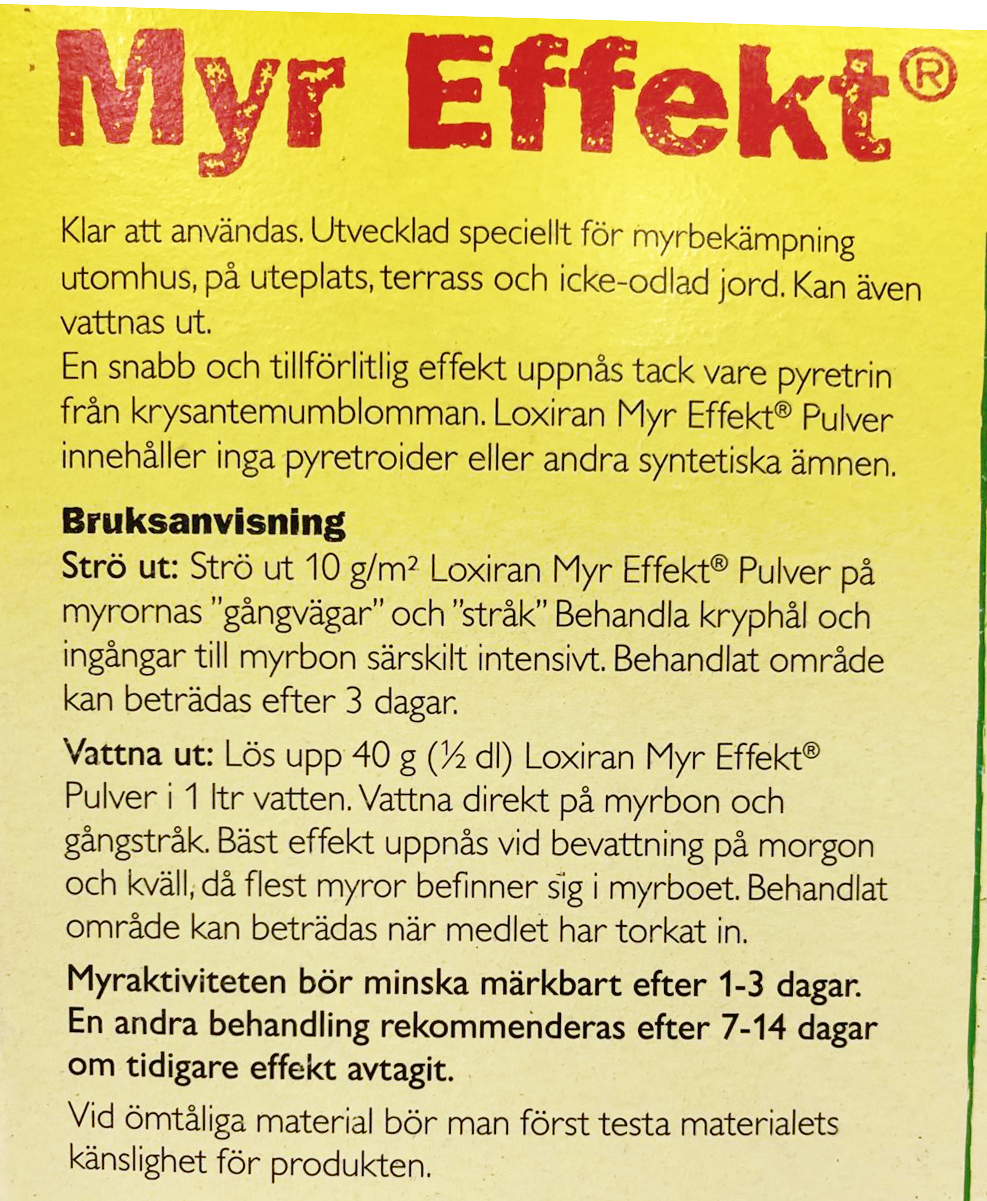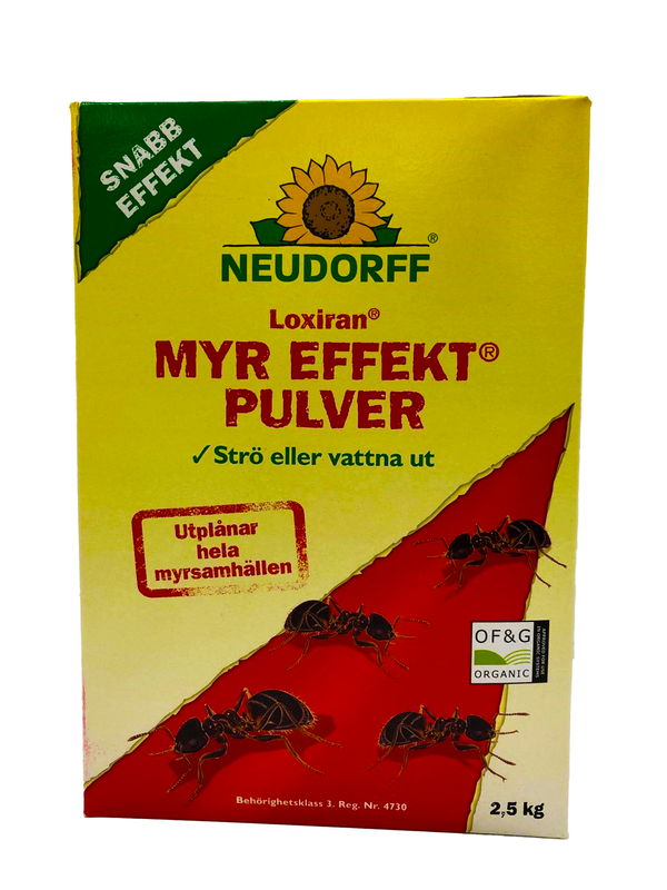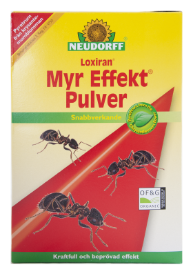 Myrpulver för effektiv bekämpning av myror utomhus. En produkt bestående av pyretrum – en substans utvunnen ur krysantemumblomman. Myr Effekt dödar myrorna genom direktkontakt, därför ska både boets in- och utgångar och arbetsmyrornas gångstråk behandlas. Det rödfärgade pulvret strös ut, eller blandas med vatten för utvattning.