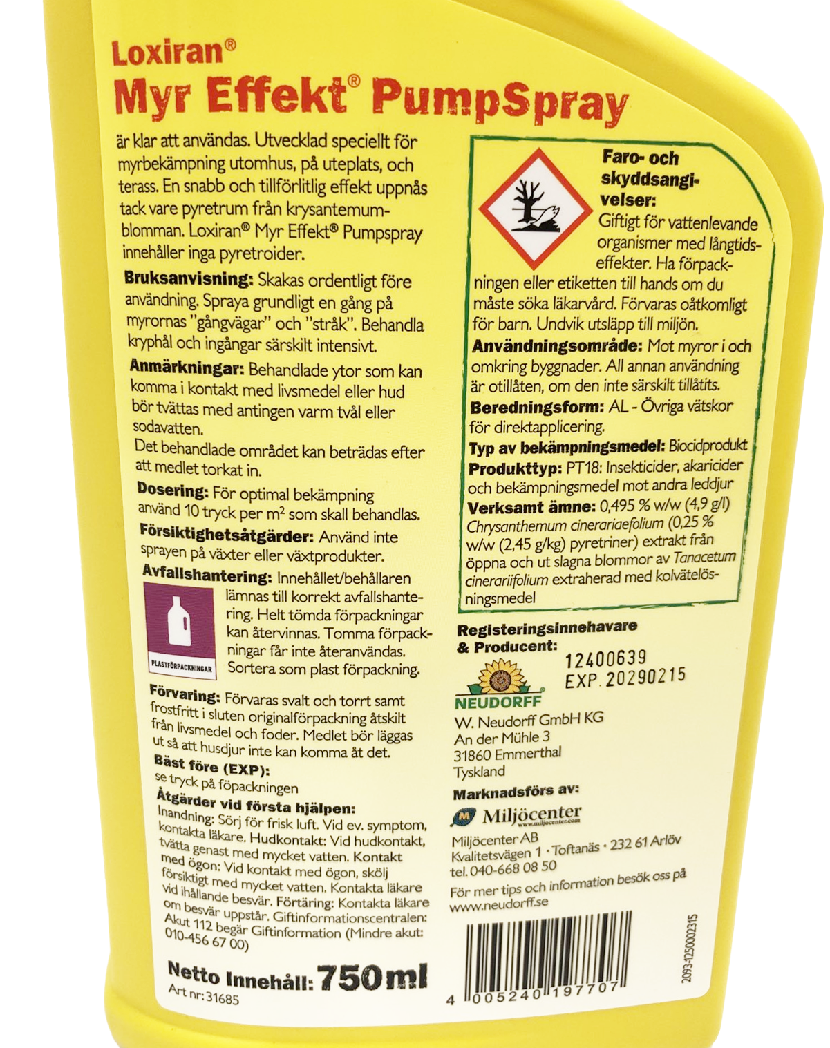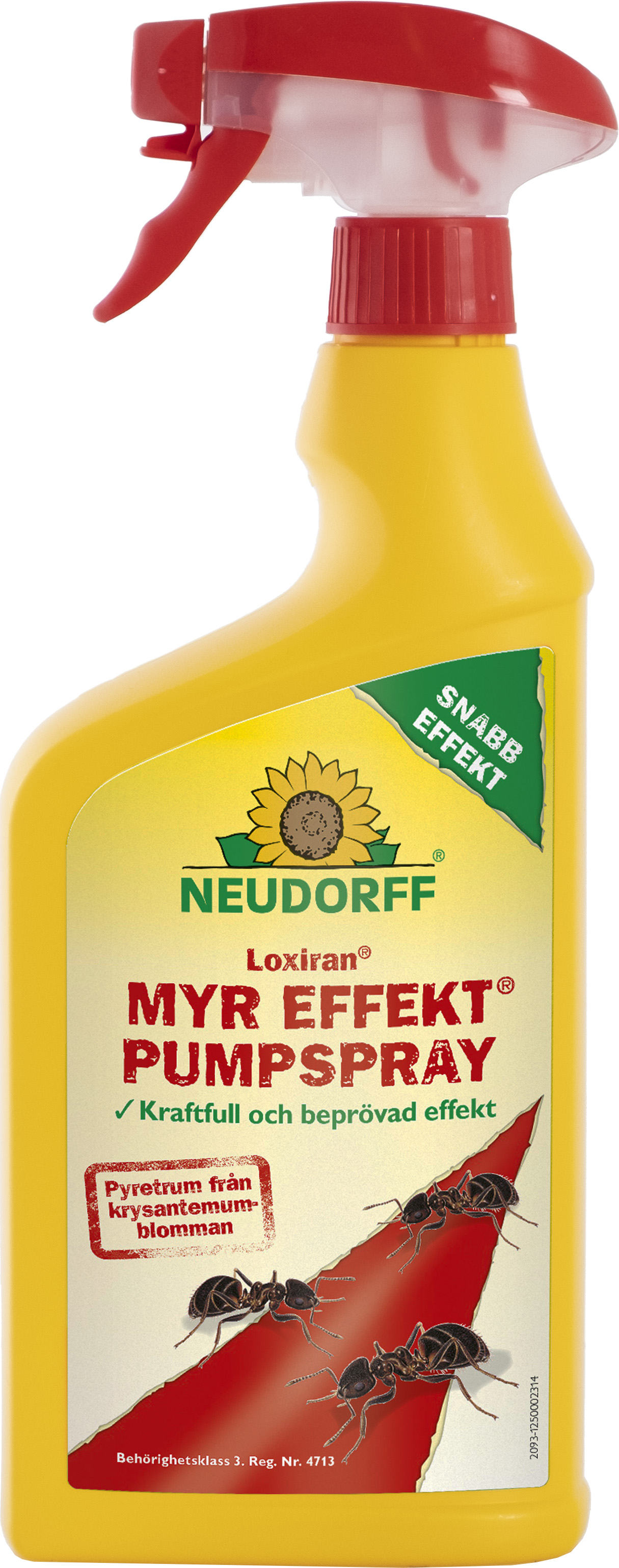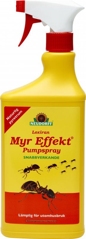 Loxiran® Myr Effekt® pumpspray. Innehållsämne: 2,5 g/l Pyretrum (extrakt från Chrysanthemum cinerariaefolium) 18,8 g/l rapsolja.