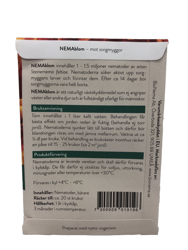 Nemablom innehåller 1-1,3 miljoner nematoder som angriper sorgmyggans larver i jorden. Larverna livnär sig på rötter vilket allvarligt skada växterna.