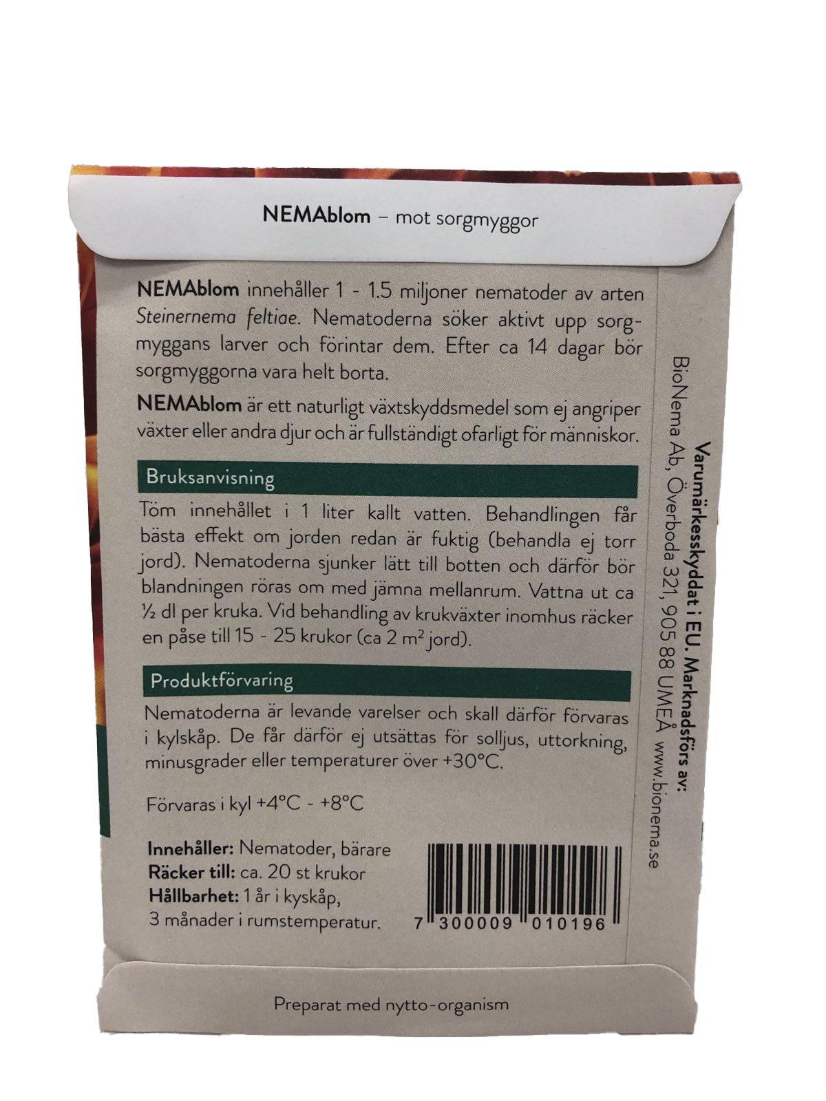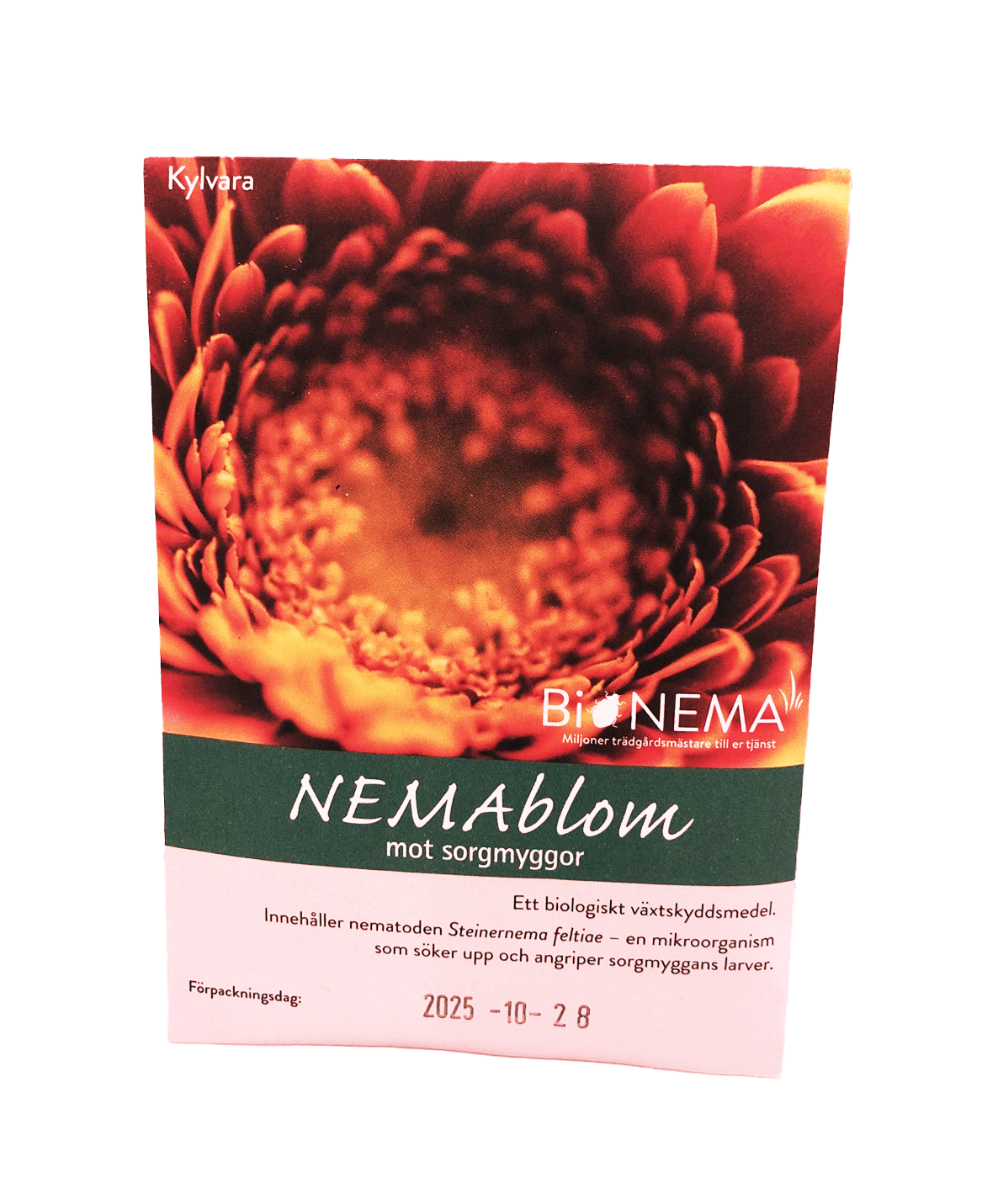 OBS! Nemasys-produkter är färskvara. Beställ inte nematoder om du inte tänkt behandla inom en snar framtid. Hållbarhet på nematoderna är 1-3 veckor från att du får hem de. Förvaras i kyl. Ekologiskt godkända.