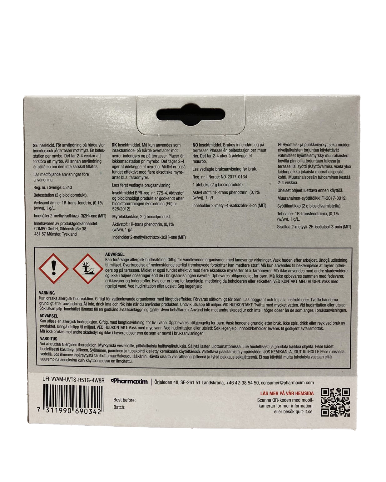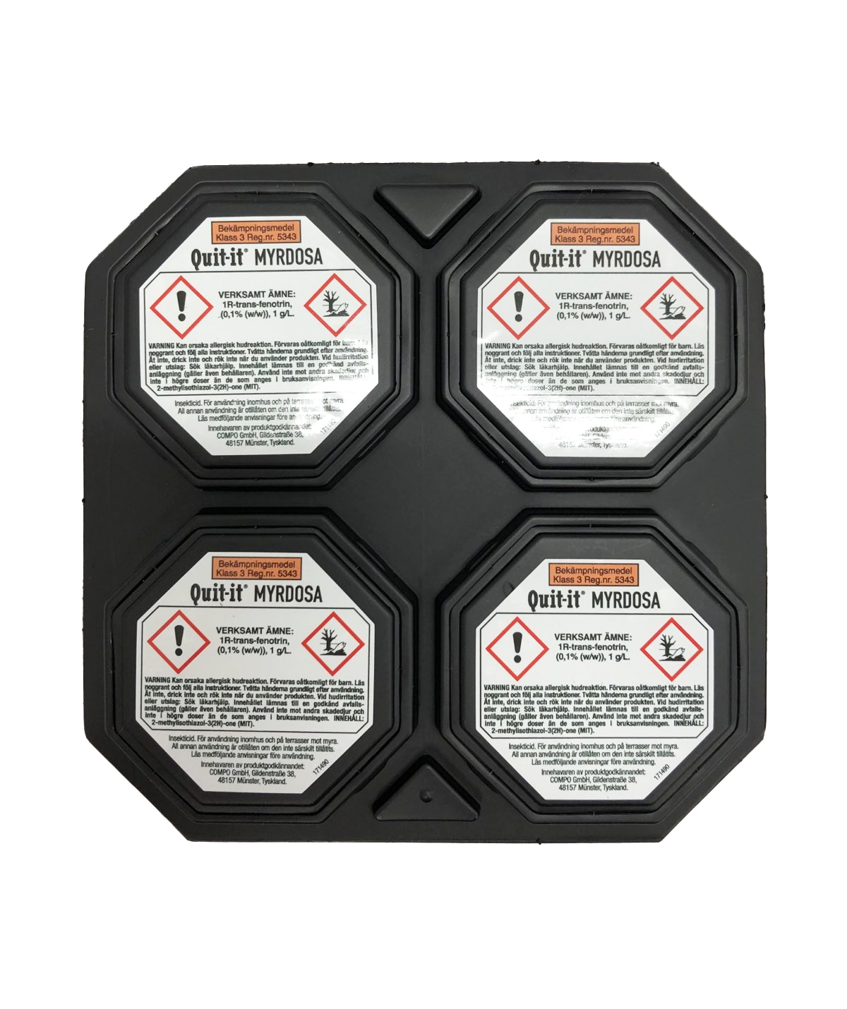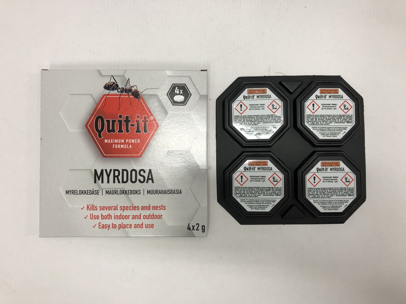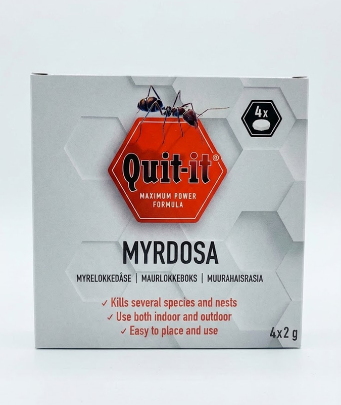Quit it Myrdosa är ett effektivt hygieniskt medel att bekämpa myror och andra krypande insekter i och omkring huset.