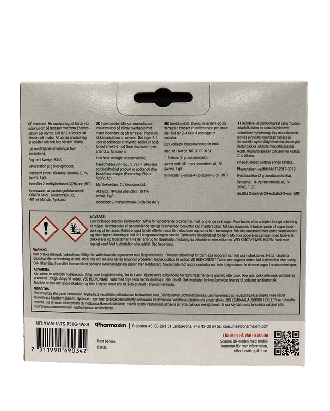 är ett effektivt gift mot myror. Myrorna tar med sig medlet till boet och delar med sig av födan till