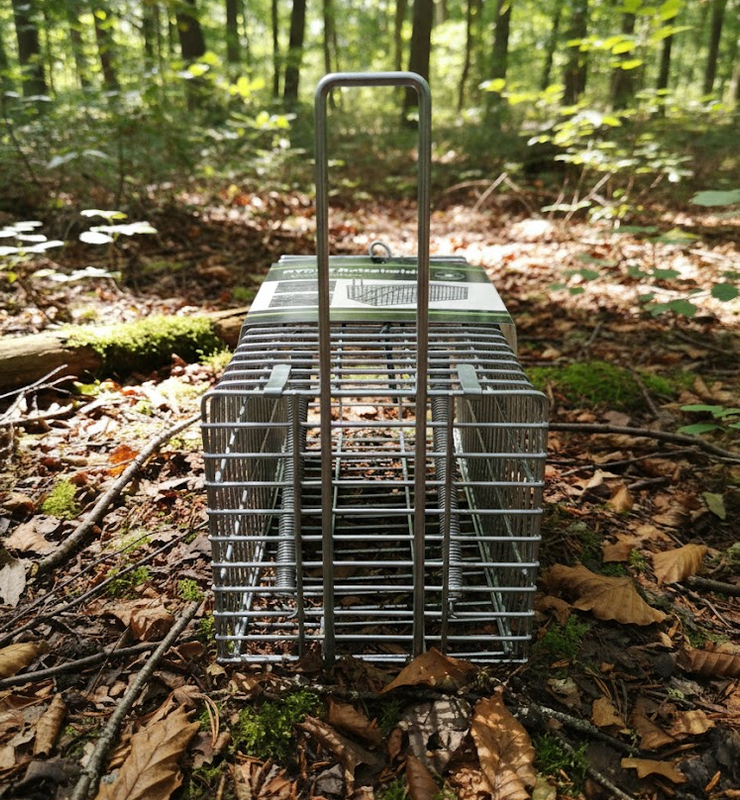 Bärhandtag med skyddsplåt – flytta fällan utan att komma i kontakt med fångsten.