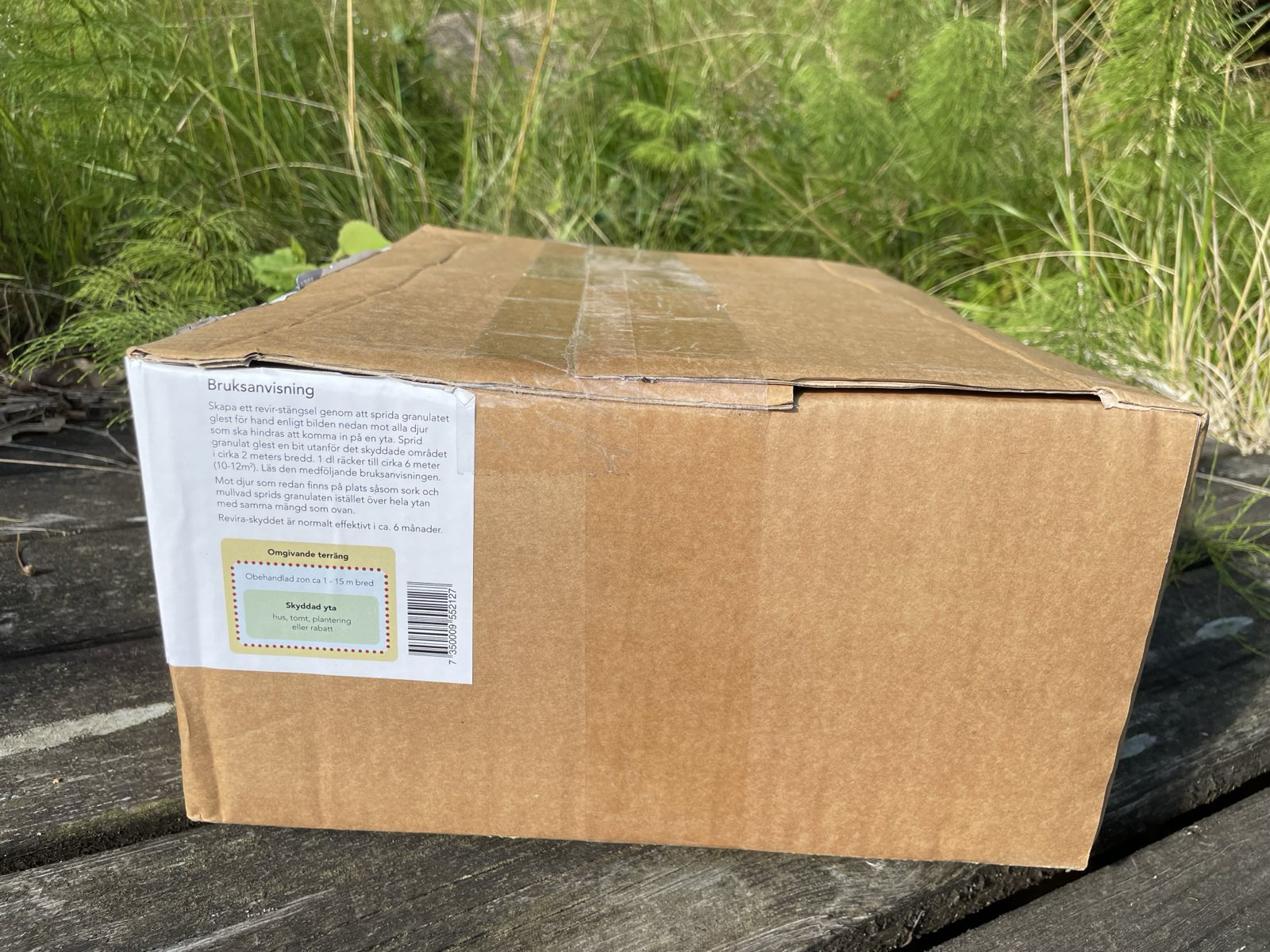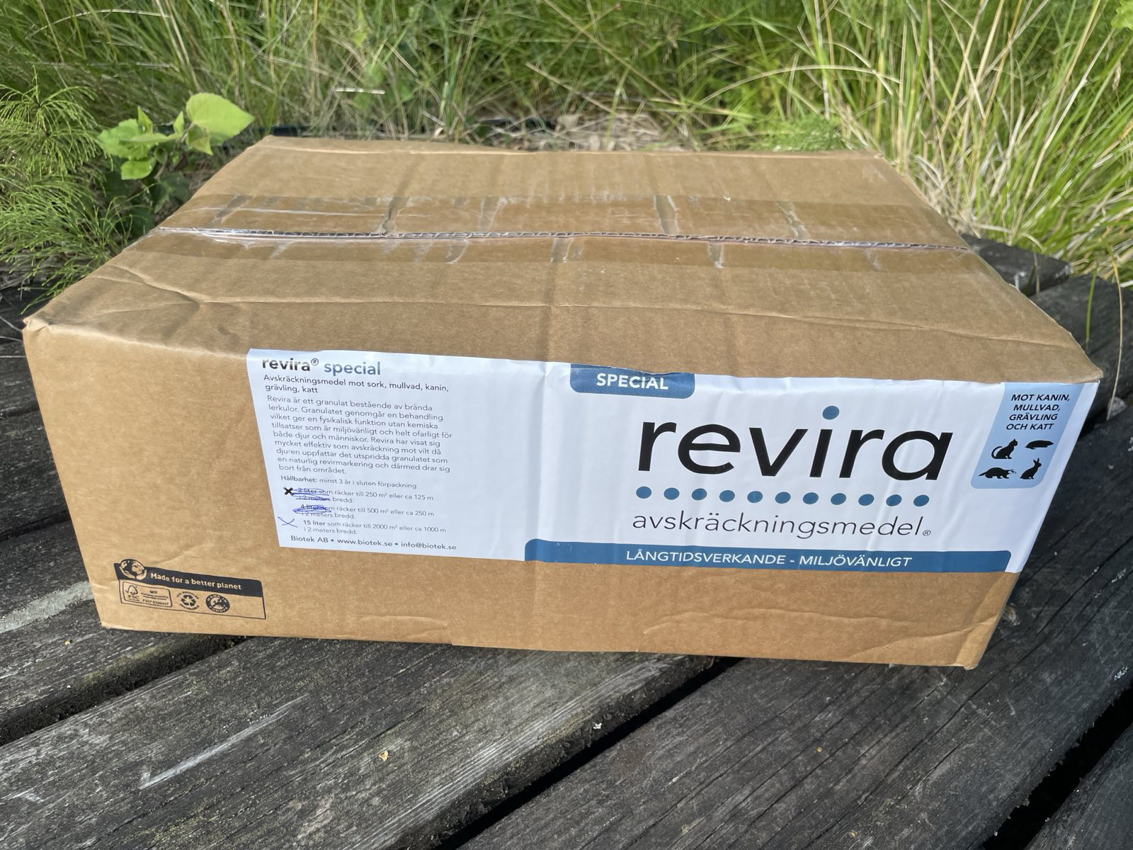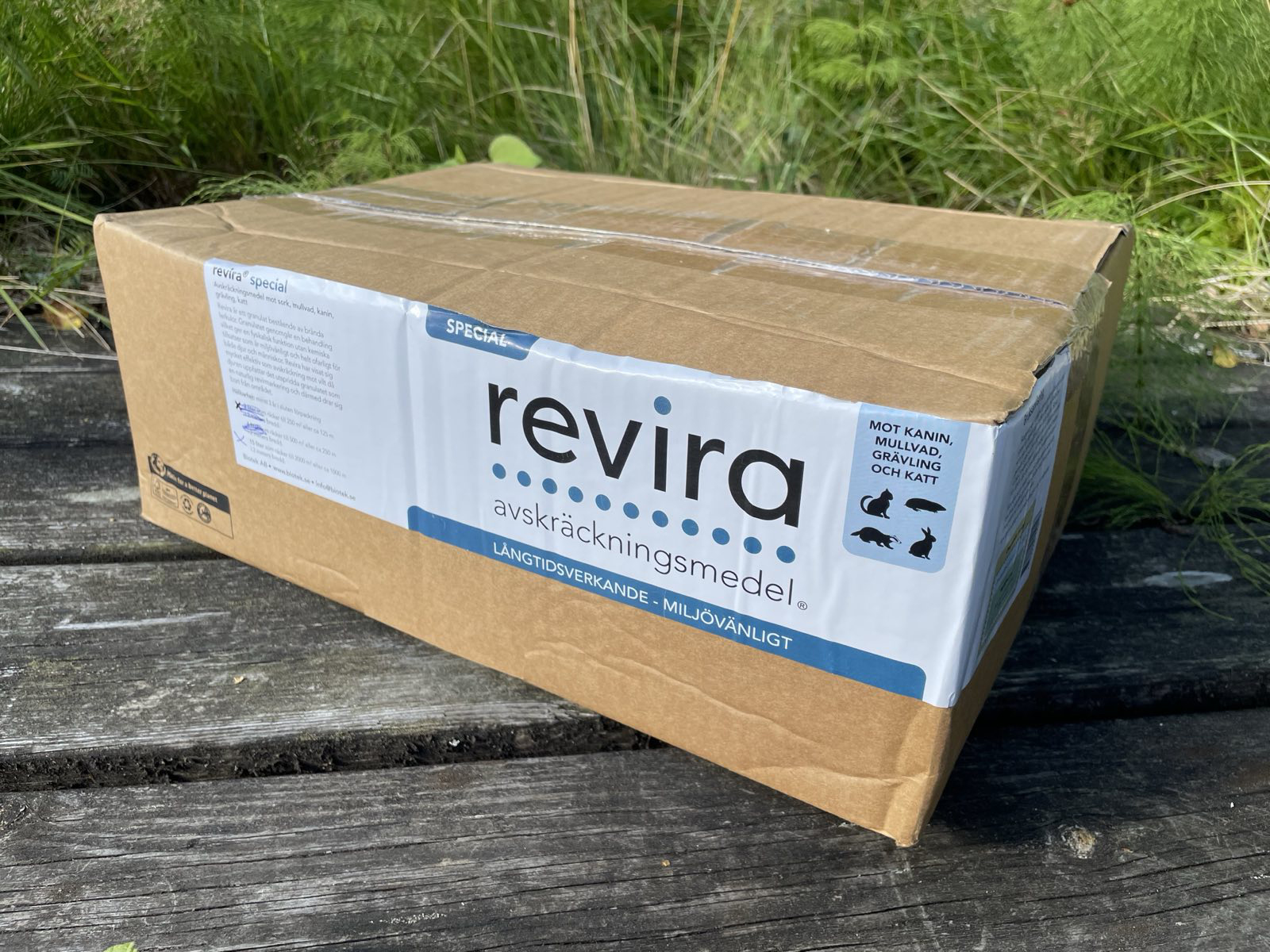 Revira viltskydd är effektivt, lätt att sprida, luktfritt, drygt, ekonomiskt, ofarligt, miljövänligt och en behandling räcker upp till sex månader. Lev i wellkartong och inte plasthink.