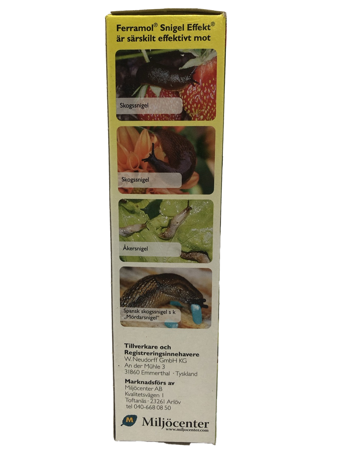 - Järn-III-fosfat är det enda verksamma ämne som är godkänt för bekämpning av sniglar för privatpersoner i Sverige.