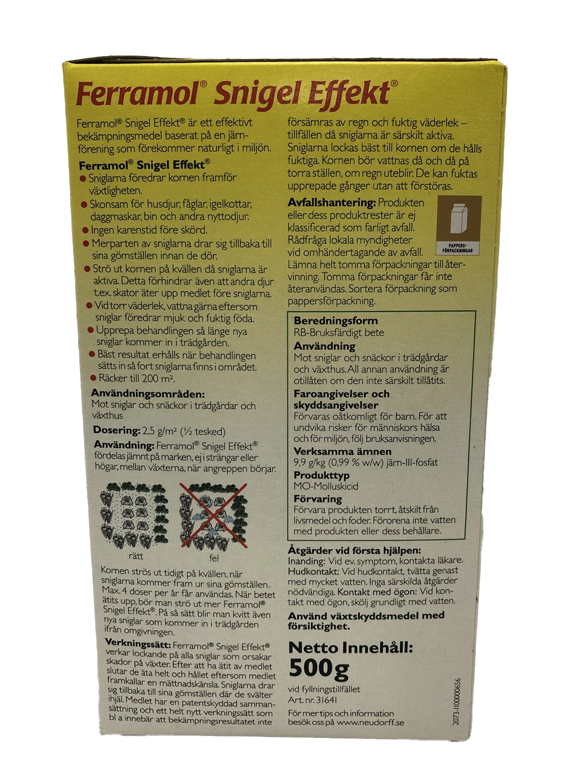 - Strö ut 5 g/m² på de områden där sniglar förekommer. Ferramol