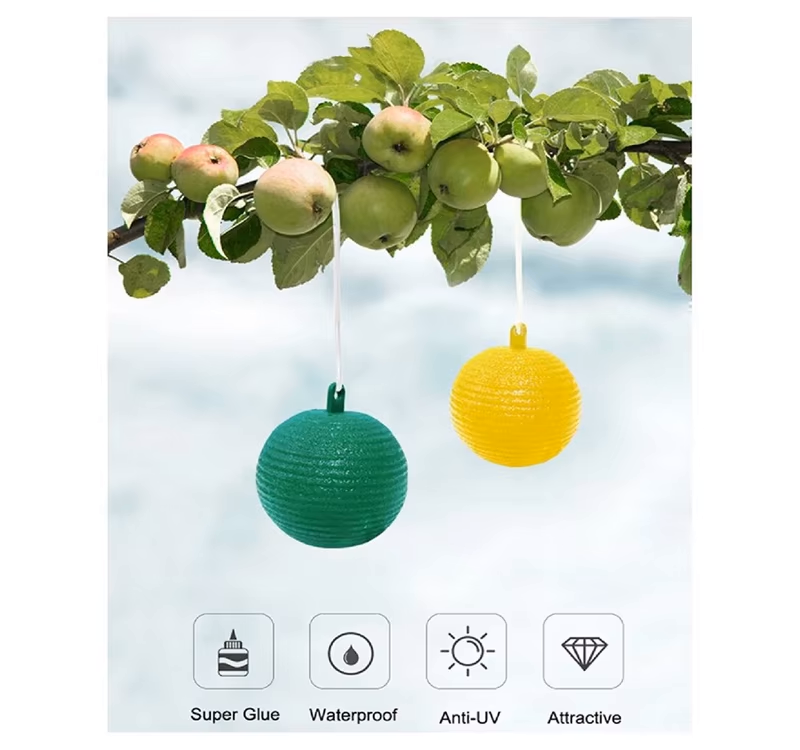 Denna flugfälla är ett effektivt verktyg för att minska antalet flugor, fruktflugor och andra flygande insekter i trädgårdar, på gårdar och andra utomhusområden. Bollen är designad för att locka till sig flugor med sin klibbiga yta och kan återanvändas efter rengöring.