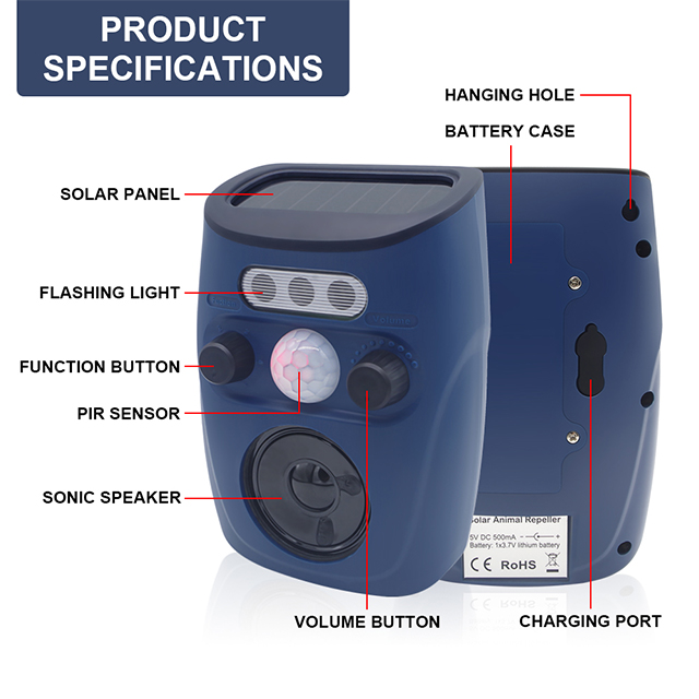 - Enheten har 3 starka LED-blixtar för att effektivt skrämma bort djur i mörker.