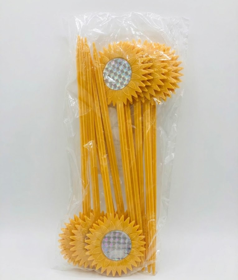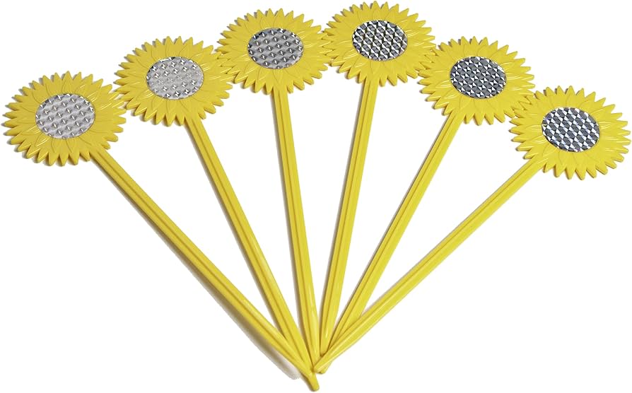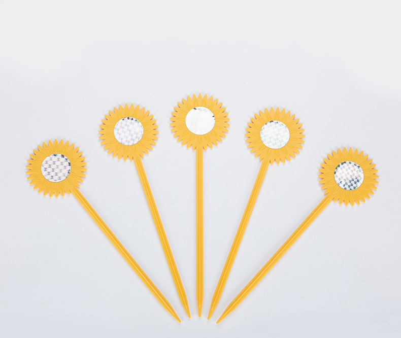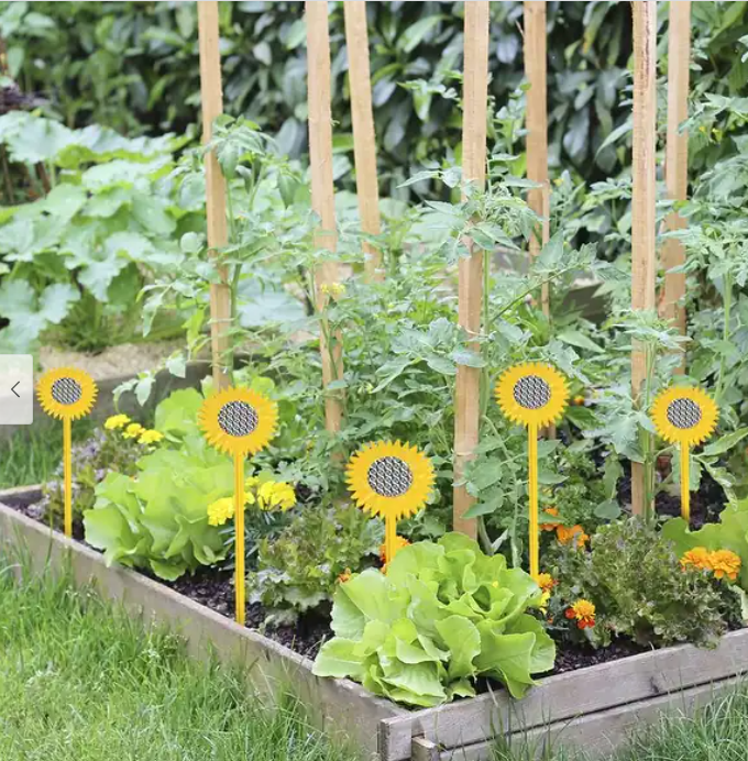 Färggranna solros-formade stavar med en reflektiv platta i mitten som avskräcker fåglar från rabatter, grönsaksland och trädgårdar.