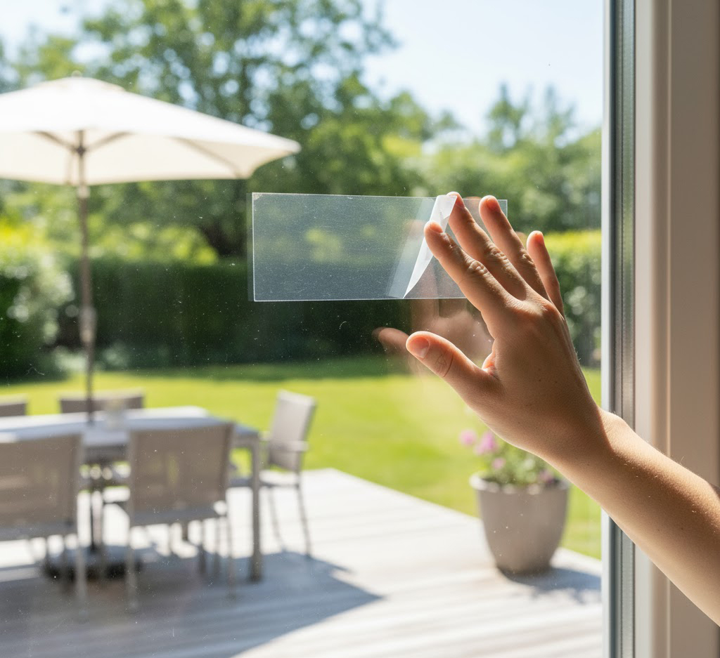Trekk først av beskyttelsesfilmen fra den dobbeltsidige tapen og fest fellen på vinduet. Ta deretter av beskyttelsespapiret