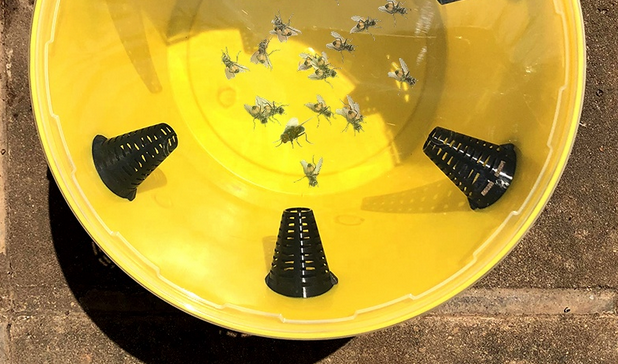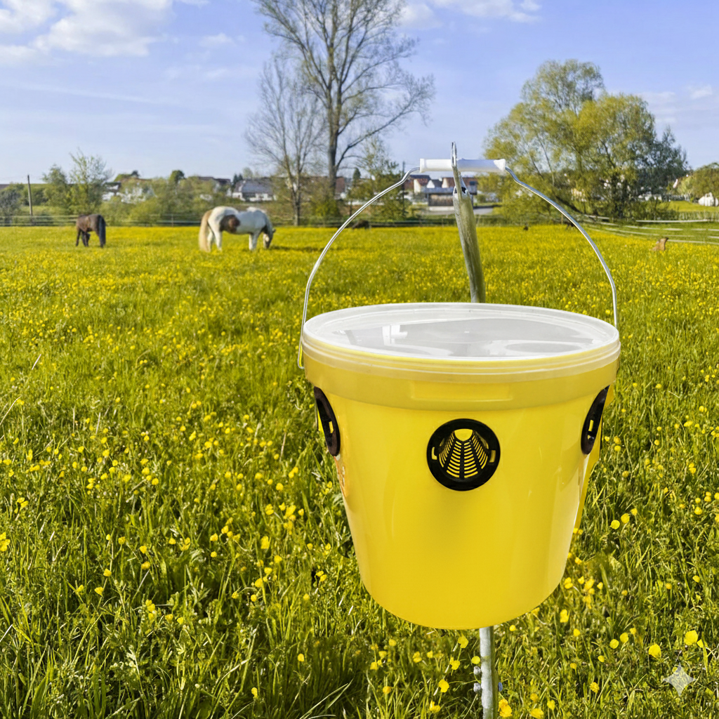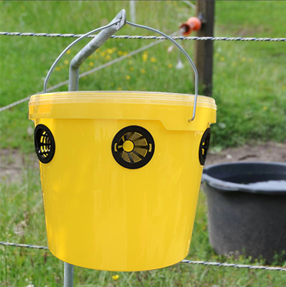 Robust plastfälla för flugor och getingar utomhus. Effektiv runt uteplatser, sopkärl, stallar, kompost och odlingar.