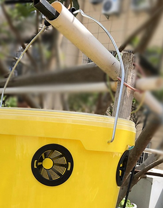 Behållaren fylls med lockvätska som doftar starkt och drar till sig flugor/getingar.