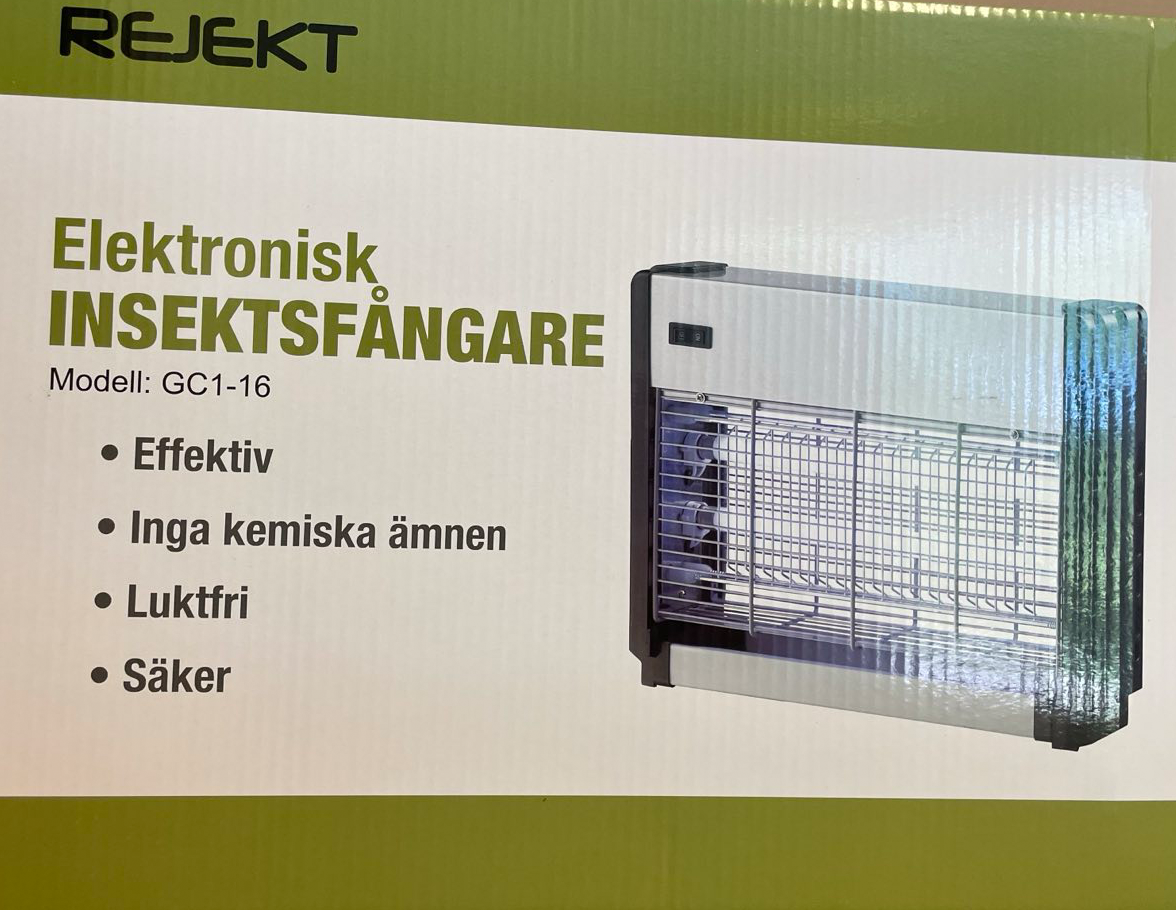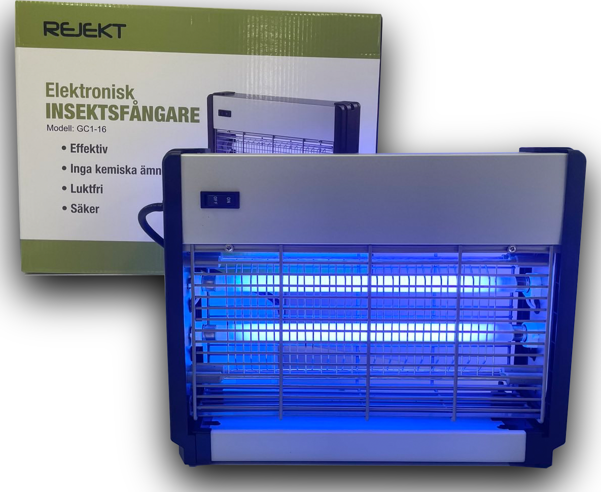 Teknik: Utrustad med UV-A tube (365 nm) och elektriskt laddat metallgaller.