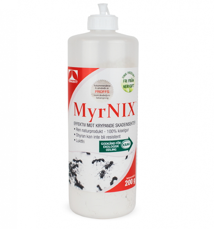 MyrNIX er det eneste i Sverige registrerte bekjempelsesmiddelet mot krypende skadedyr, som ikke inneholder nervegift. MyrNIX er dermed skånsommere for mennesker og kjæledyr. Dessuten kan skadedyr ikke bli resistente mot MyrNIX, i motsetning til bekjempelsesmidler basert på nervegift der resistens kan utvikles på relativt kort tid.