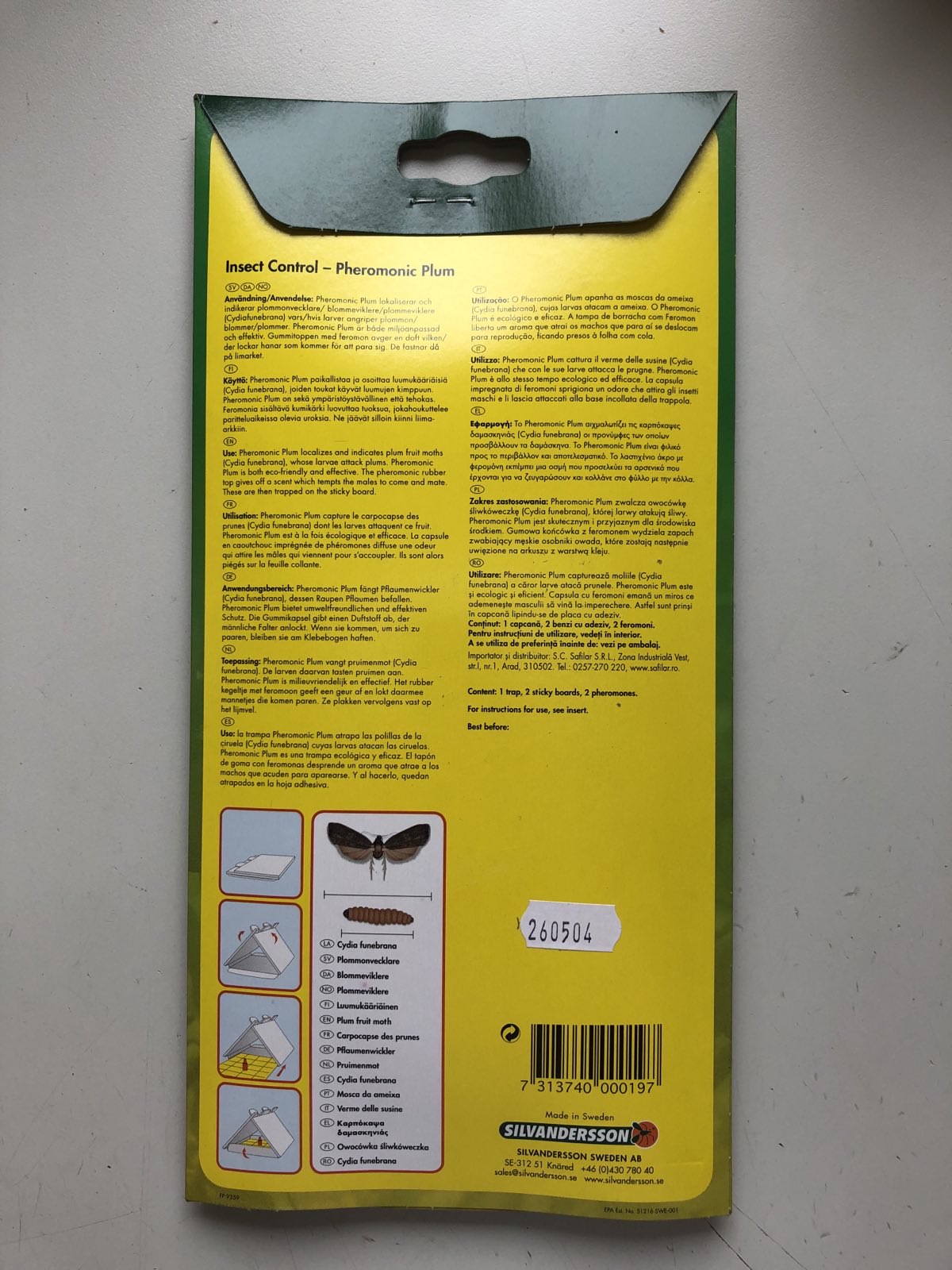 Innehåll: 1 fälla, 2 limark, 2 feromontoppar