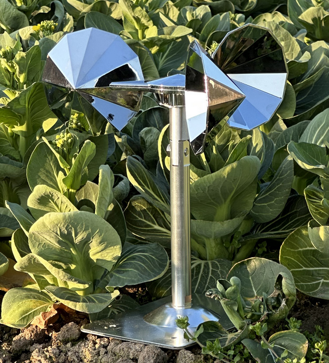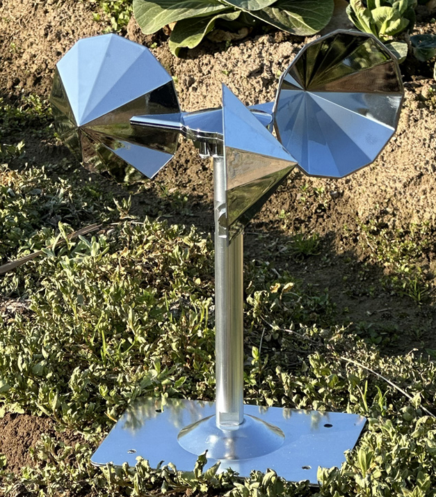 Visuell avskräckning: Spegelliknande blad som snurrar i vinden och skapar oförutsägbara ljusblixtar som fåglar undviker.