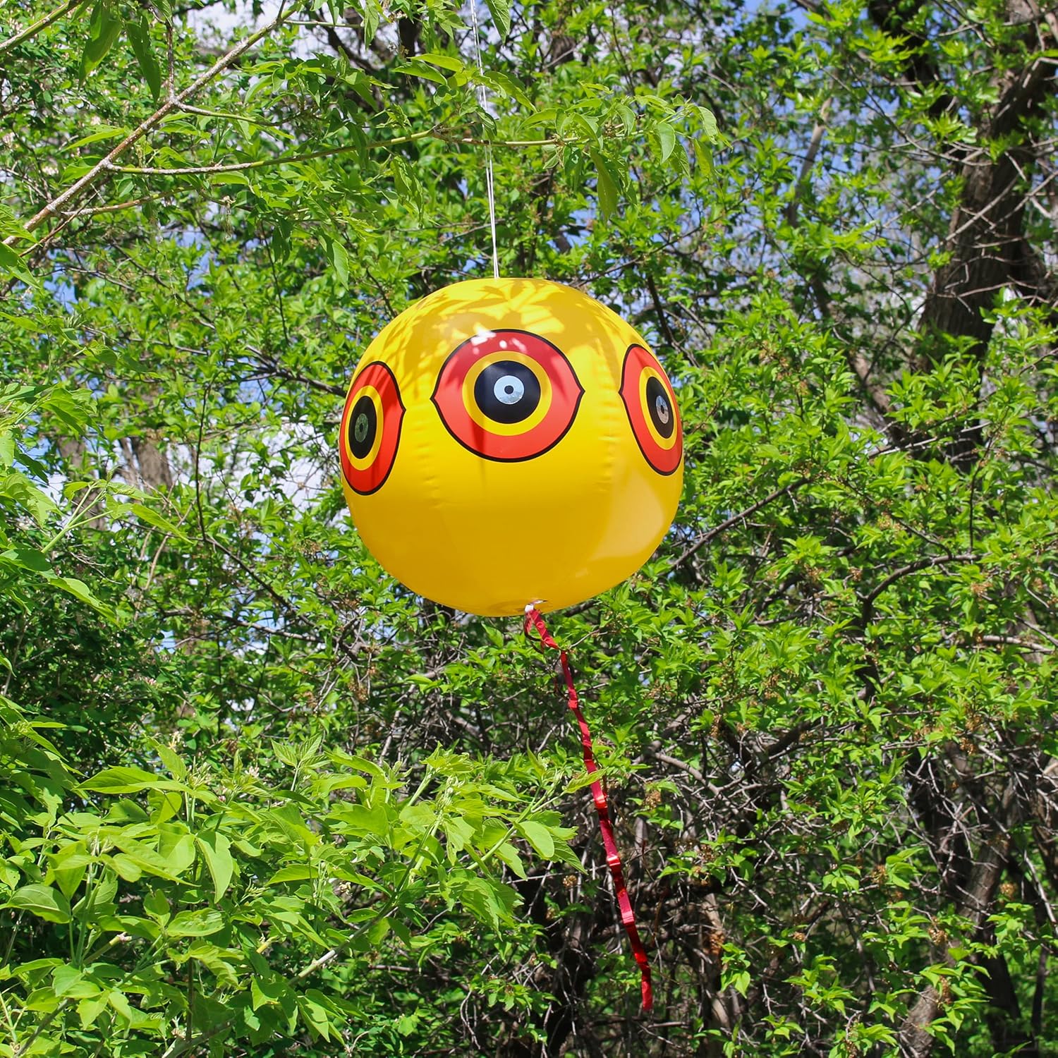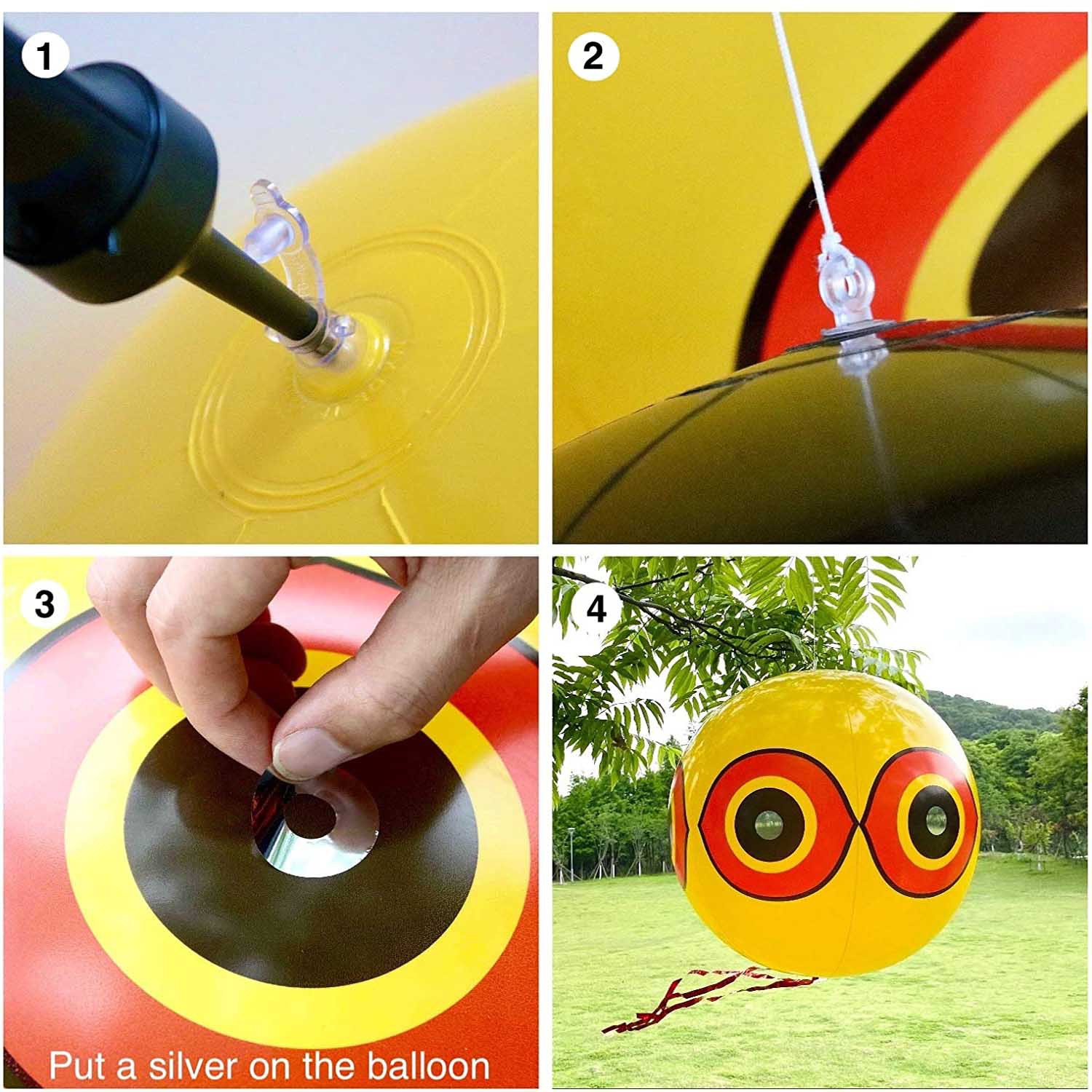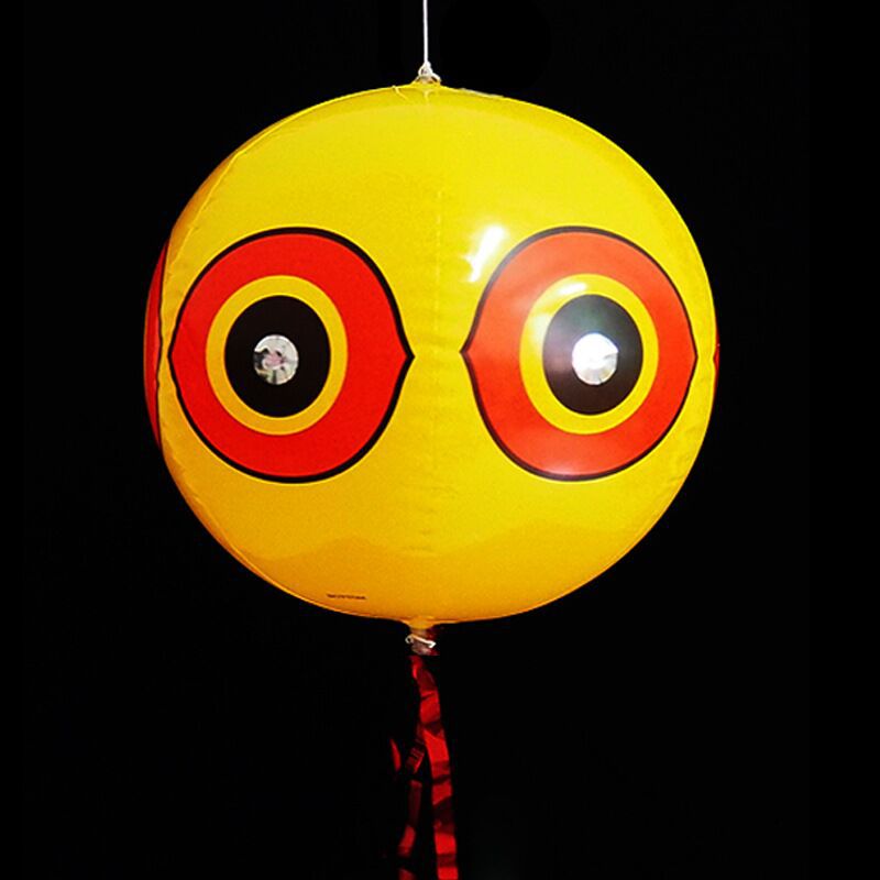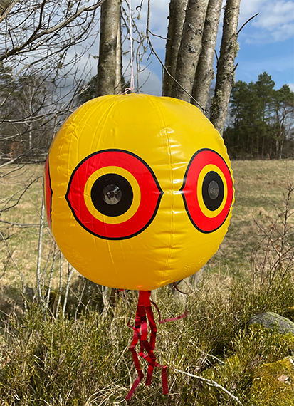 Linnunkarkotin, joka näyttää petoeläimen silmältä ja karkottaa lintuja. Karkotin puhalletaan täyteen ja ripustetaan puuhun tai tolppaan.