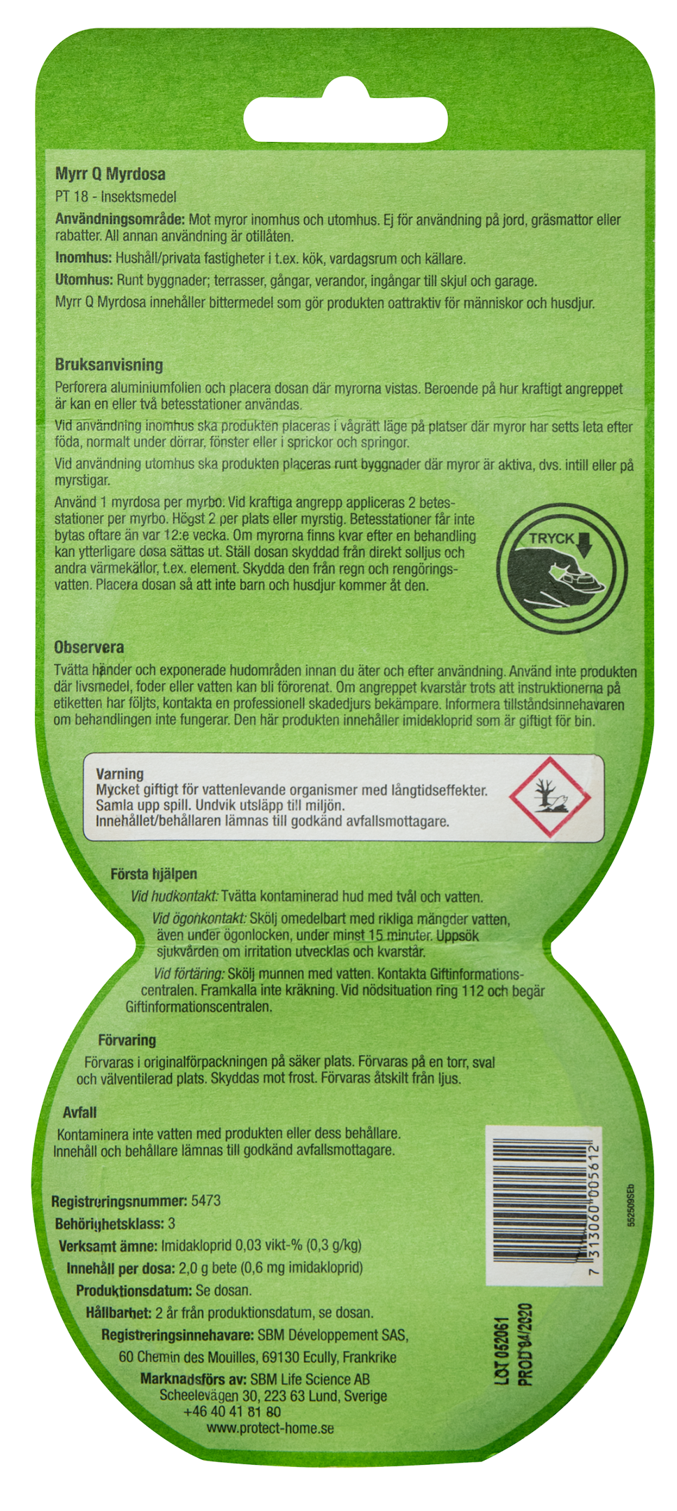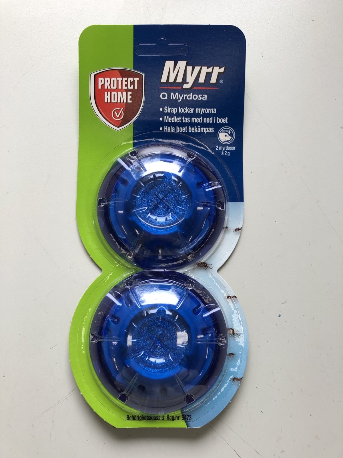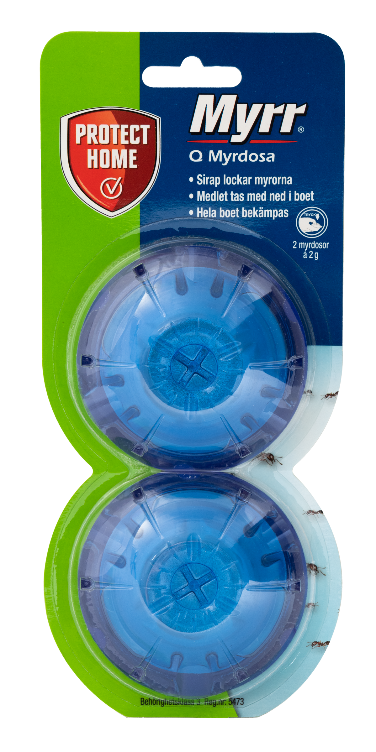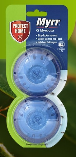 Painamalla peukalolla sinisen muovin keskellä olevaan ristiin, avaat sen alla olevan kalvon. Täältä muurahaiset löytävät tiensä makean sisällön luokse ja ne torjutaan tehokkaalla biosidisella aineella, joka on sekoitettu siirappiin, jota muurahaiset tavoittelevat. Jos kohtaat suurempia muurahaisongelmia, tai jos tuntuu, ettei yksi aktivoitu ansa riitä, voit asettaa toisen ansan tehostamaan vaikutusta. Muista, että muurahaisansat tulisi asettaa vaakasuoraan paikkoihin, joissa olet nähnyt muurahaisia kerääntyvän – usein ruokavarastojen tai elintarvikkeiden läheisyydessä. Yleensä mustia muurahaisia näkee ovien, ikkunapuitteiden ja erilaisten halkeamien ja rakojen lähettyvillä. Myrr Q Muurahaisansa on tarkoitettu sisäkäyttöön, mutta sitä voidaan käyttää myös rakennusten ympärillä tai varastotiloissa.