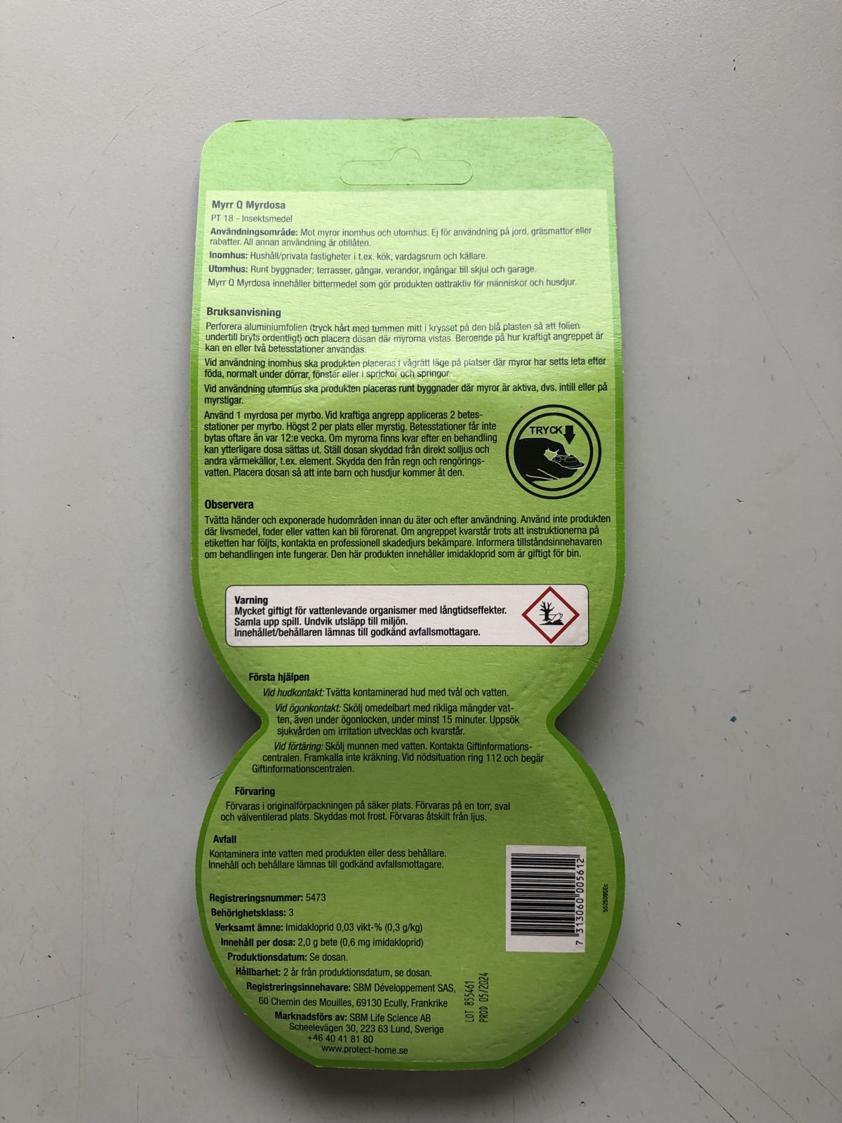 Jos sinulla on sisätiloissa ei-toivottuja mustia muurahaisia, Myrr tarjoaa tehokkaan muurahaisansan, joka on erityisesti suunniteltu mustia muurahaisia varten. Ansa on nimeltään Myrr Q Muurahaisansa, ja se toimii jopa kolme kuukautta aktiivisessa tilassa. Se on joustava ja helppo sijoittaa haluttuun paikkaan – mielellään mahdollisimman lähelle muurahaisia! Tämä onnistuu ansan takapuolella olevan teipin ansiosta, joka tarttuu lähes kaikille pinnoille. Muista kuitenkin pitää ansa aina vaakasuorassa asennossa. Sijoita se strategiseen paikkaan muurahaisten lähelle. Ansa sisältää biosidista ainetta ja siirappia, joka houkuttelee mustia muurahaisia, jotka vievät torjunta-aineen takaisin pesään. Tämä tarkoittaa, että torjut muurahaiset laajasti ja tehokkaasti.