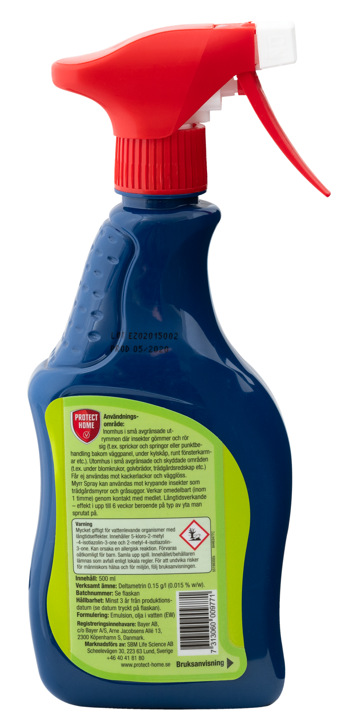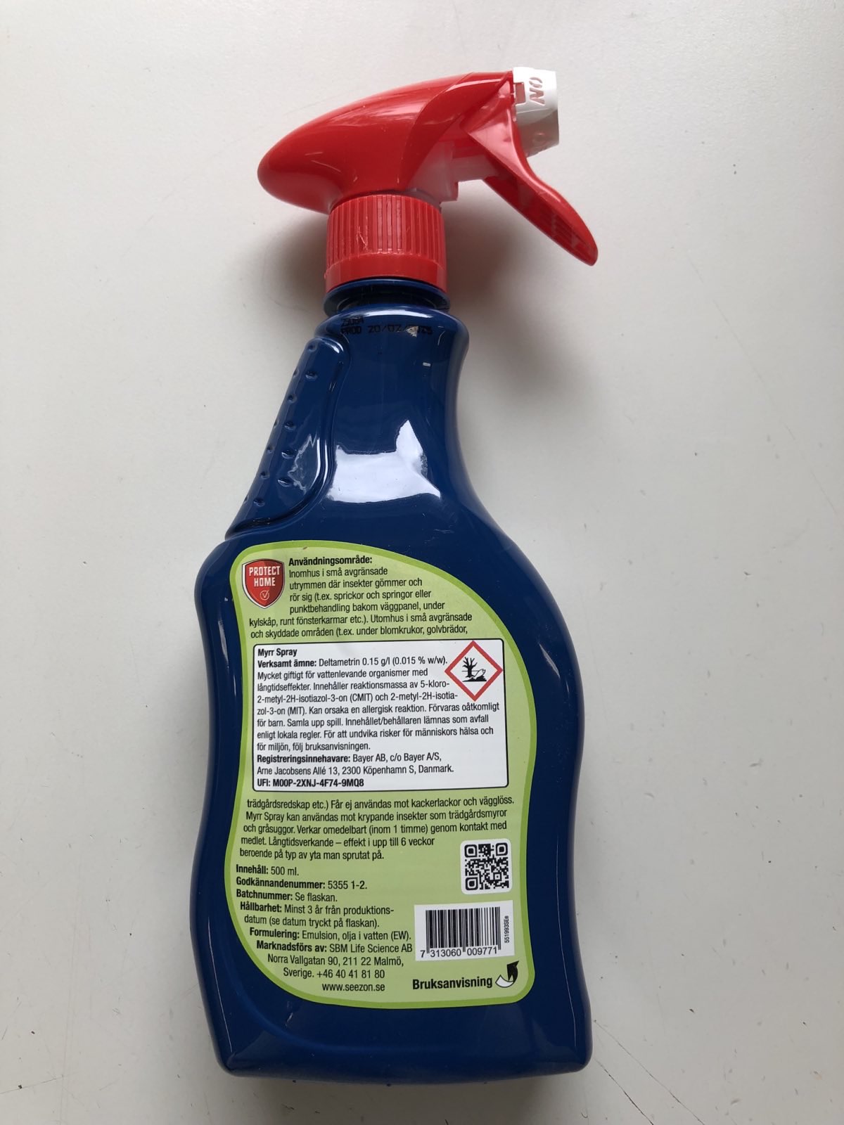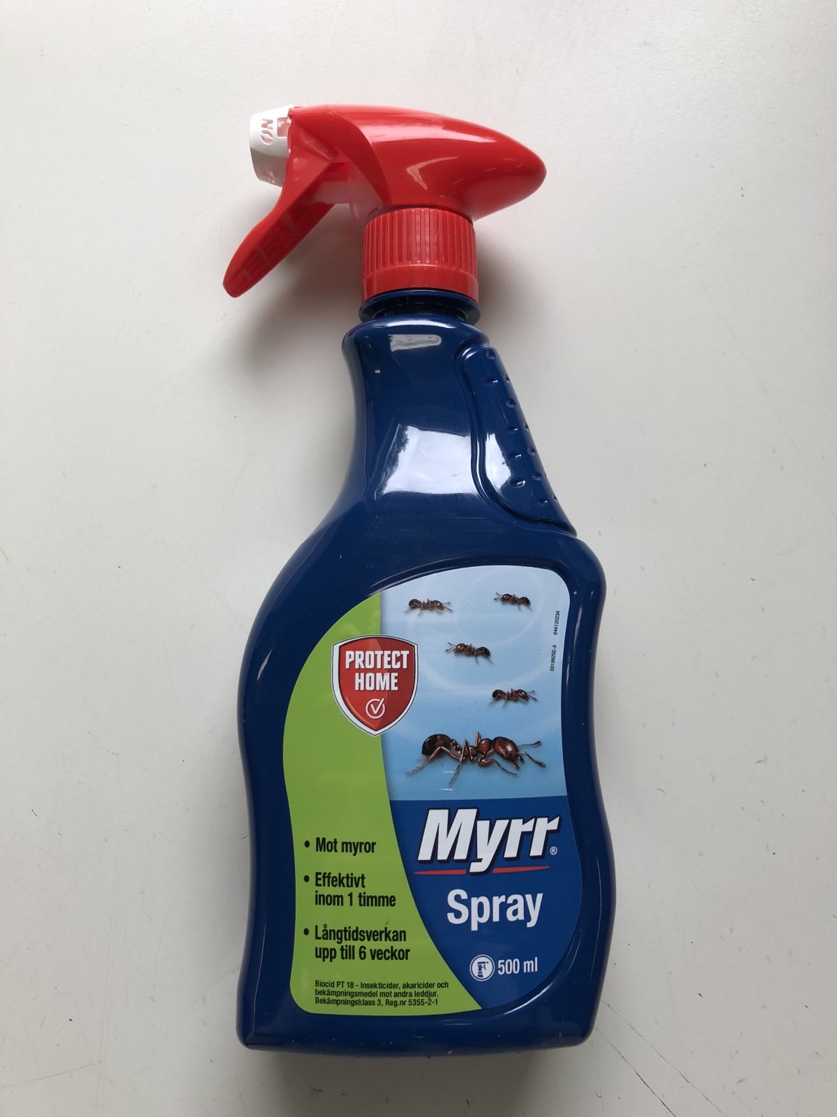 Onko kotisi vallannut muurahaiset tai muut pikkuhyönteiset? Myrr Sprayn avulla voit tehokkaasti torjua muurahaisia ja pitää ne loitolla jopa kuuden viikon ajan, sen pitkävaikutteisten ominaisuuksien ansiosta. Tämä kätevä spray sopii täydellisesti vaikeapääsyisiin paikkoihin, kuten seinäpaneelien taakse, ikkunanpieliin tai lattialautojen väliin. Se ei vain torju muurahaisia välittömästi, vaan suojaa myös kotiasi tulevilta hyökkäyksiltä pitkään. Myrr Spray on erinomainen työkalu muurahaisten karkottamiseen kodissa.