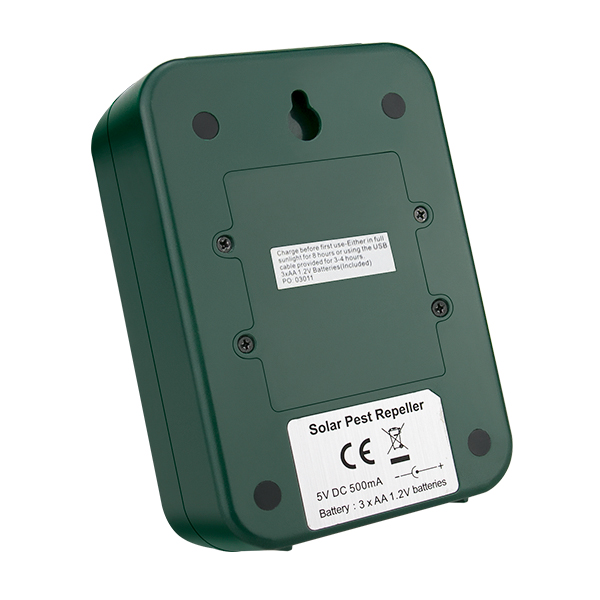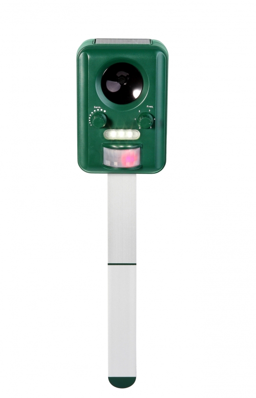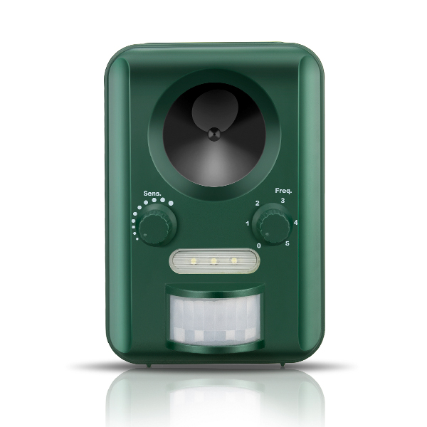 Toiminto, joka antaa sinulle vapauden säätää, mihin eläimiin karkotin on tehokas kyseisellä hetkellä. Tehokas esimerkiksi koiria, kissoja, peuroja, hiiriä, rottia ym. vastaan. Toimii aurinkokennoilla tai ladataan USB-liitännällä. Käyttäjäystävällinen: helppo säätää, mihin eläimiin karkotin on tehokas. Ulkokäyttöön. Kattaa 70 neliömetrin alueen kartionmuotoisesti kaiuttimesta.
