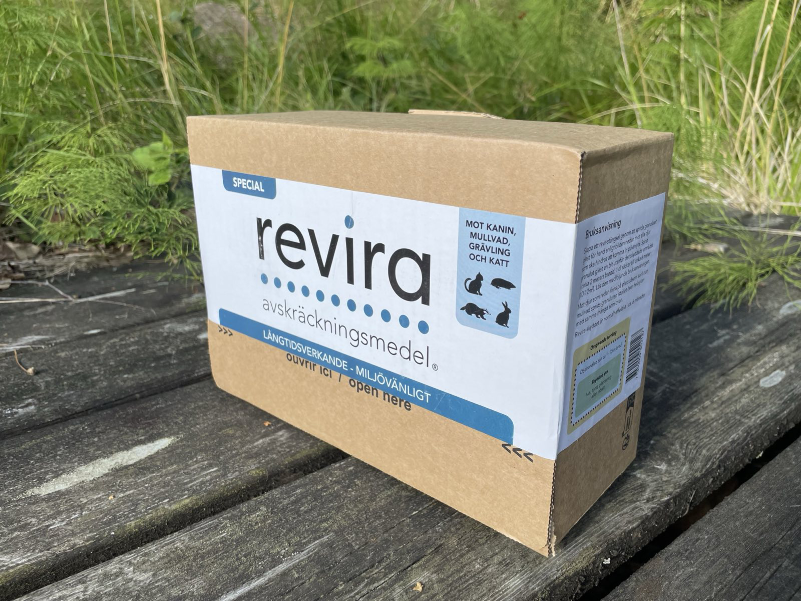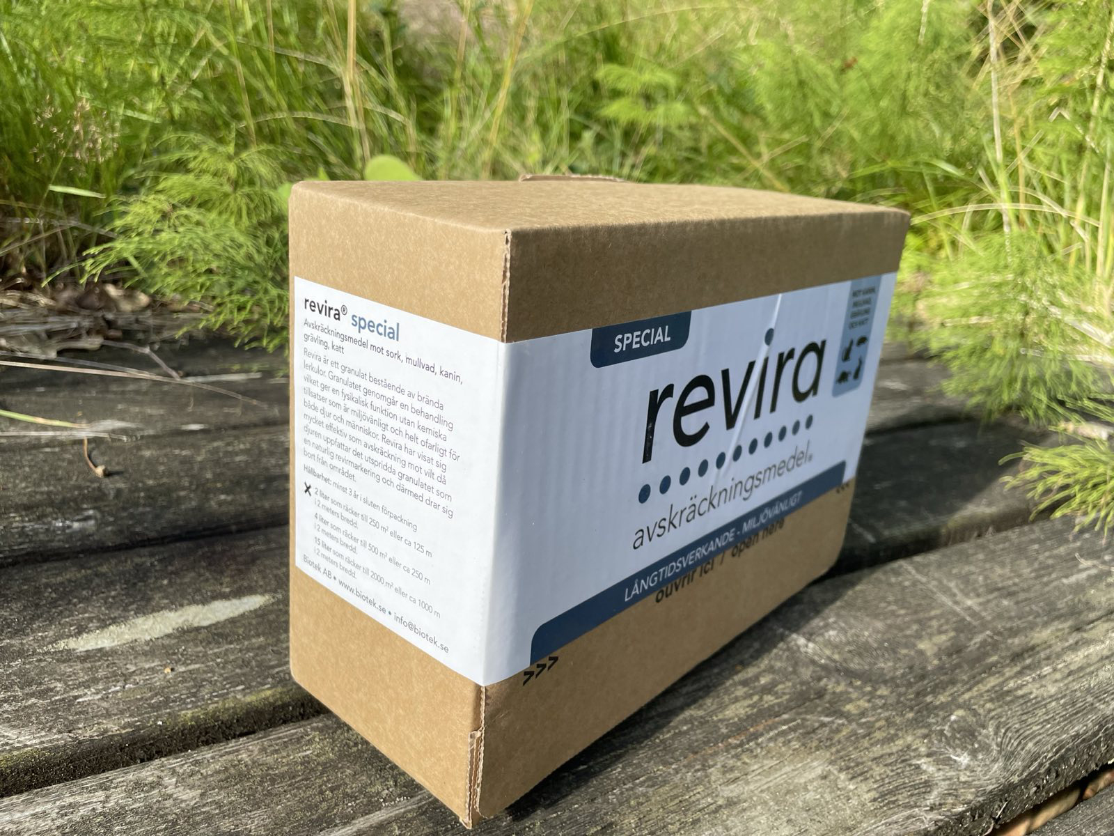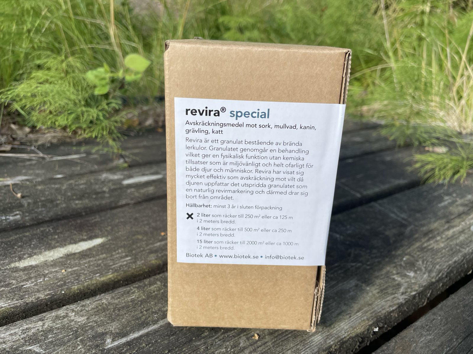 Revira-villisuojus on tehokas, helppo levittää, hajuton, riittoisa, taloudellinen, vaaraton, ympäristöystävällinen, ja yksi käsittely kestää jopa kuusi kuukautta. Toimitetaan pahvilaatikossa, ei muovisangossa. 2 litraa riittää 250 neliömetrille tai noin 125 metriin 2 metrin leveydeltä.