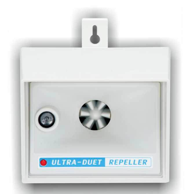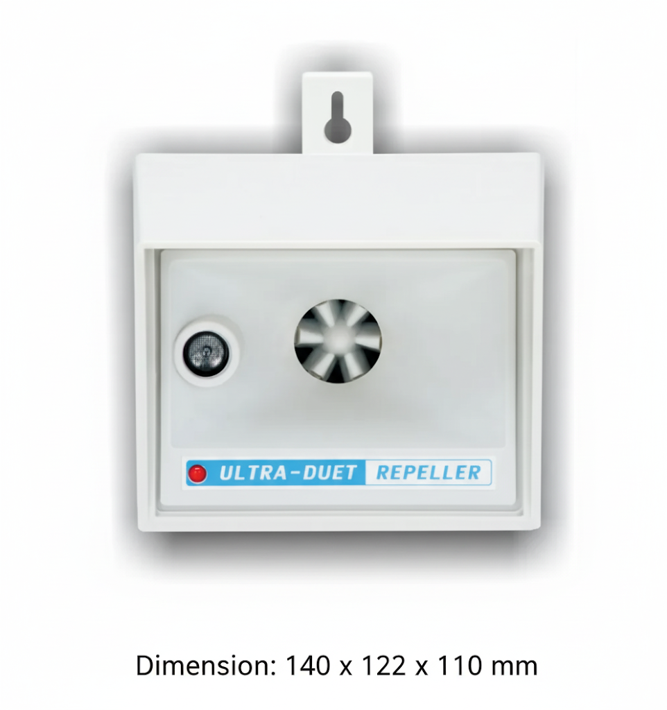 Toimii tuholaisia vastaan, kuten hiiret, rotat, kissat, koirat, oravat ja peurat. Karkotin lähettää pyyhkäisevän taajuuden välillä 20 000 Hz - 60 000 Hz. Koska äänilähteet menevät päällekkäin, karkotusteho kasvaa.